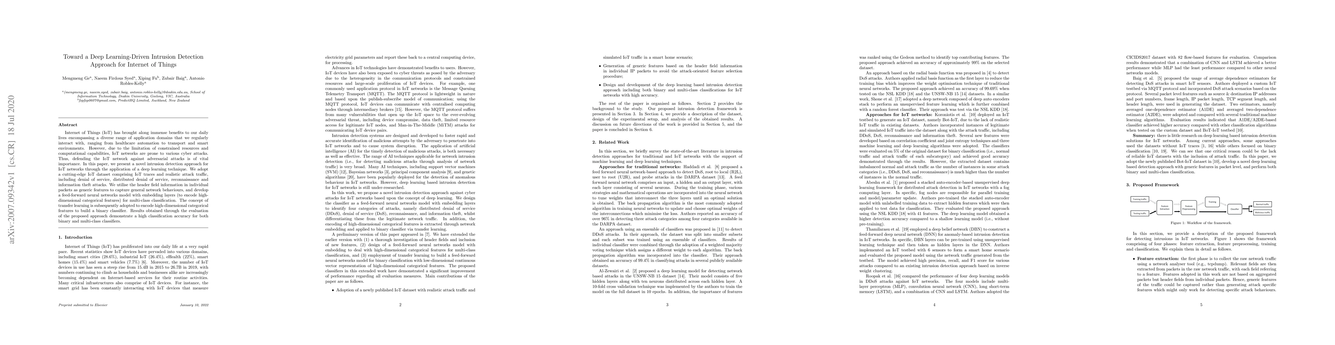 Internet of Things (IoT) has brought along immense benefits to our daily lives encompassing a diverse range of application domains that we regularly interact with, ranging from healthcare automation to transport and smart environments. However, due to the limitation of constrained resources and computational capabilities, IoT networks are prone to various cyber attacks. Thus, defending the IoT network against adversarial attacks is of vital importance. In this paper, we present a novel intrusion detection approach for IoT networks through the application of a deep learning technique. We adopt a cutting-edge IoT dataset comprising IoT traces and realistic attack traffic, including denial of service, distributed denial of service, reconnaissance and information theft attacks. We utilise the header field information in individual packets as generic features to capture general network behaviours, and develop a feed-forward neural networks model with embedding layers (to encode high-dimensional categorical features) for multi-class classification. The concept of transfer learning is subsequently adopted to encode high-dimensional categorical features to build a binary classifier. Results obtained through the evaluation of the proposed approach demonstrate a high classification accuracy for both binary and multi-class classifiers.