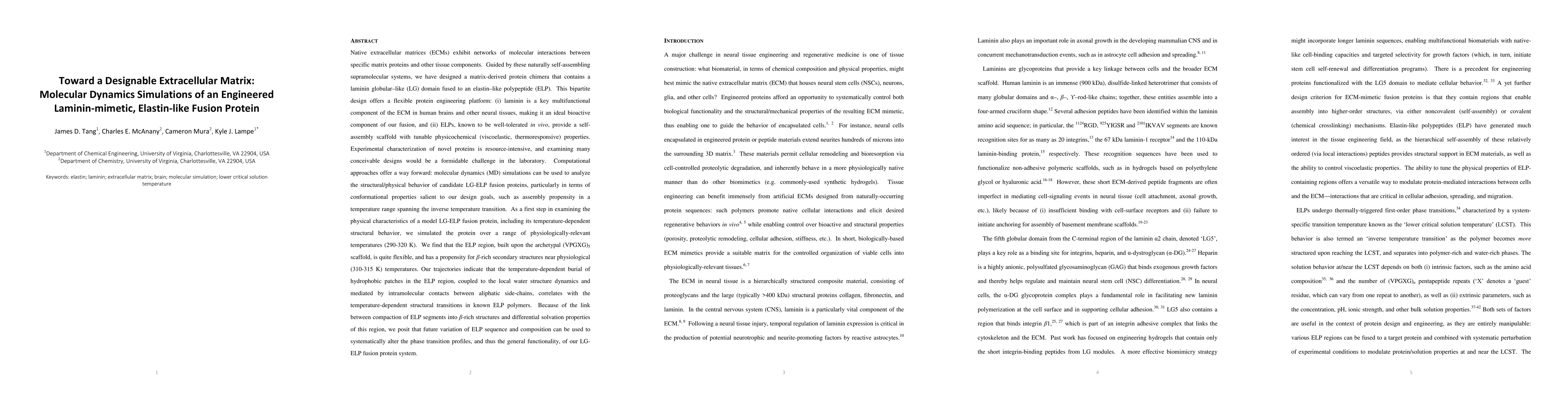 This paper designs a laminin-elastin fusion protein inspired by natural extracellular matrices and uses molecular dynamics simulations to study its temperature-dependent conformational changes, revealing its potential for tunable phase behavior and $\beta$-sheet formation.