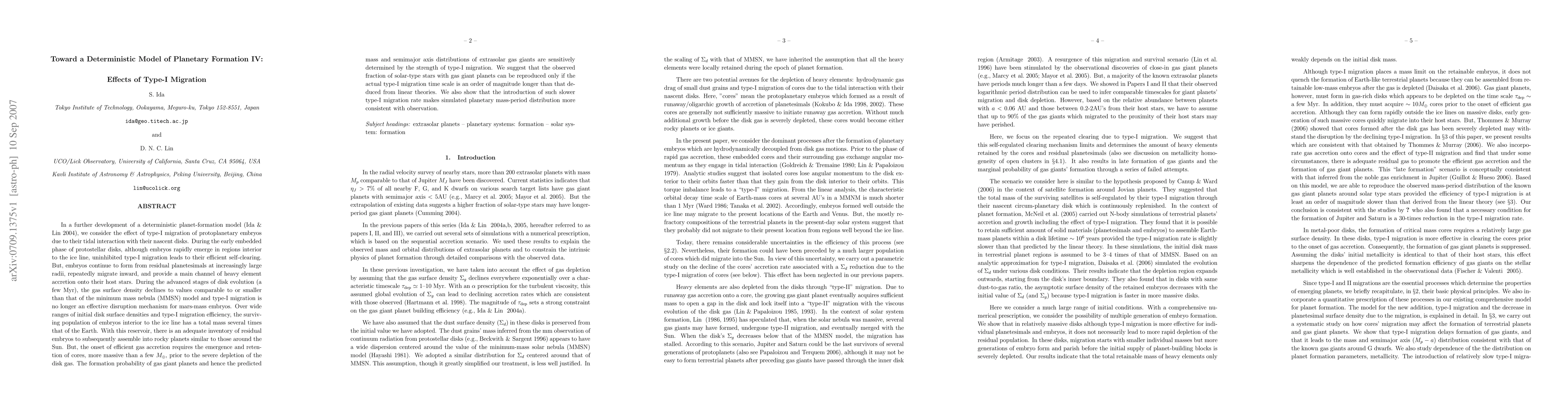This paper develops a deterministic model of planetary formation, focusing on the impact of type-I migration of protoplanetary embryos. It finds that while type-I migration leads to efficient self-clearing of embryos, it also facilitates heavy element accretion and the formation of terrestrial planets, but requires longer migration timescales than previously predicted to match observations of gas giant planets.