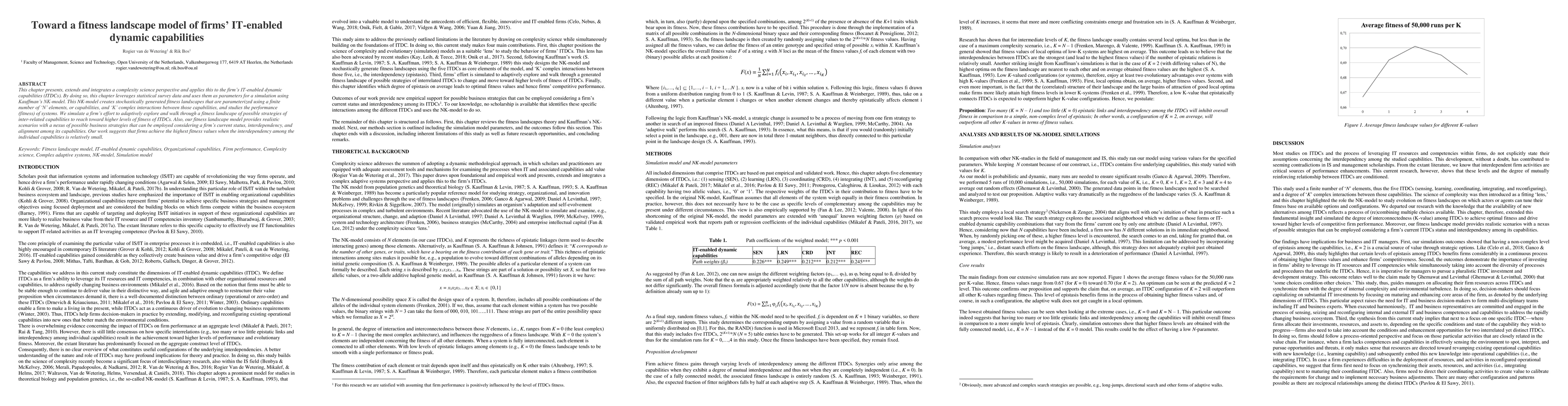 This paper develops a fitness landscape model using the NK-model to simulate firms' IT-enabled dynamic capabilities, showing that lower interdependency among capabilities leads to higher performance. The study leverages statistical survey data and provides realistic scenarios for strategic decision-making.