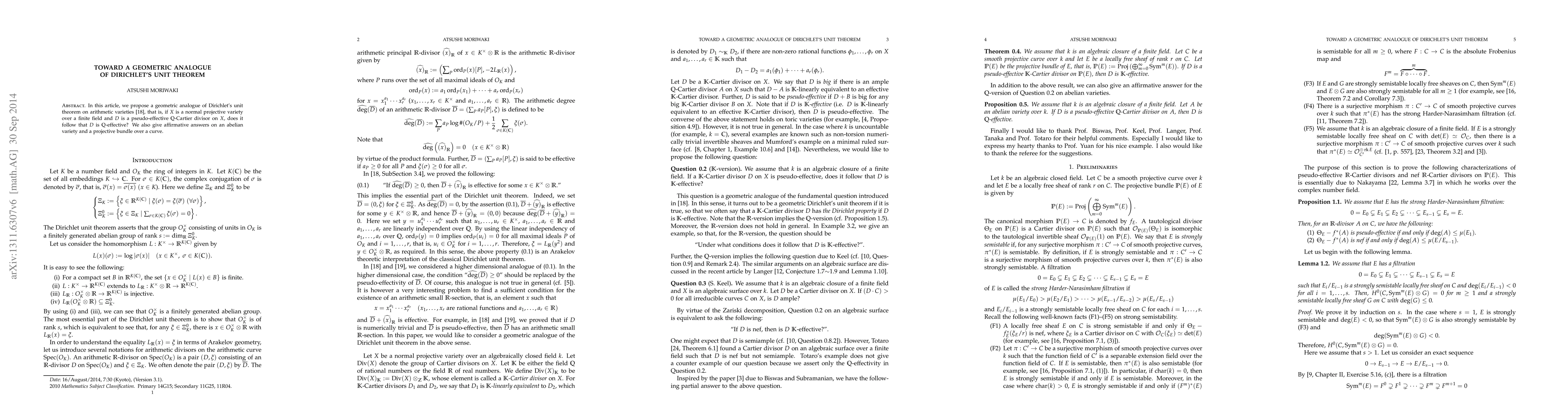 This paper proposes a geometric analogue of Dirichlet's unit theorem for arithmetic varieties, questioning whether a pseudo-effective Q-Cartier divisor on a normal projective variety over a finite field is necessarily Q-effective. The authors provide affirmative answers for abelian varieties and projective bundles over curves.