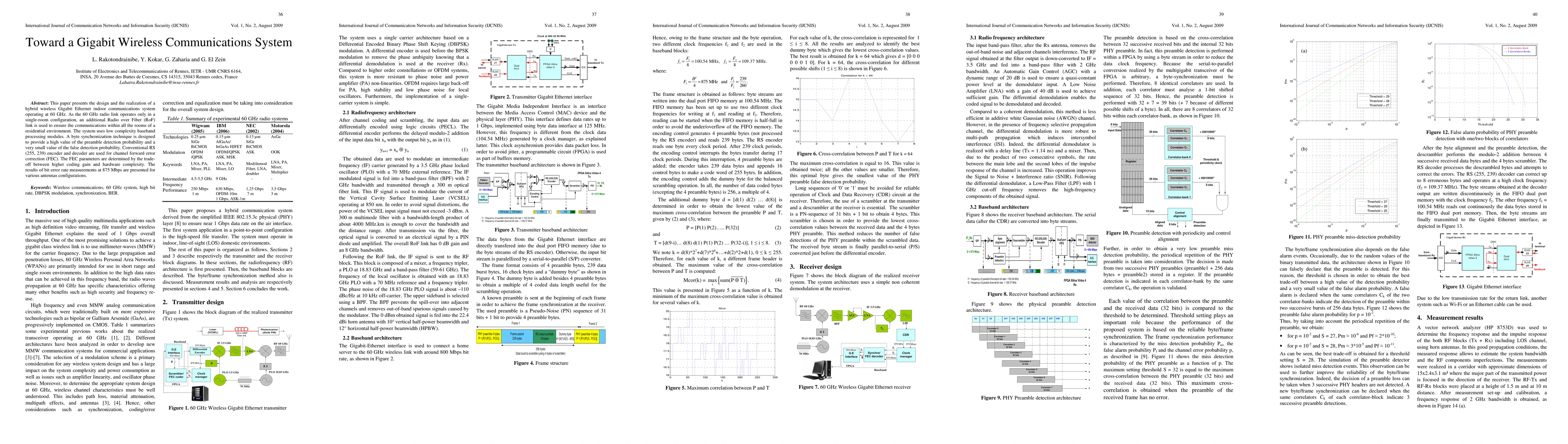 This paper presents the design and the realization of a hybrid wireless Gigabit Ethernet indoor communications system operating at 60 GHz. As the 60 GHz radio link operates only in a single-room configuration, an additional Radio over Fiber (RoF) link is used to ensure the communications within all the rooms of a residential environment. The system uses low complexity baseband processing modules. A byte synchronization technique is designed to provide a high value of the preamble detection probability and a very small value of the false detection probability. Conventional RS (255, 239) encoder and decoder are used for channel forward error correction (FEC). The FEC parameters are determined by the tradeoff between higher coding gain and hardware complexity. The results of bit error rate measurements at 875 Mbps are presented for various antennas configurations.