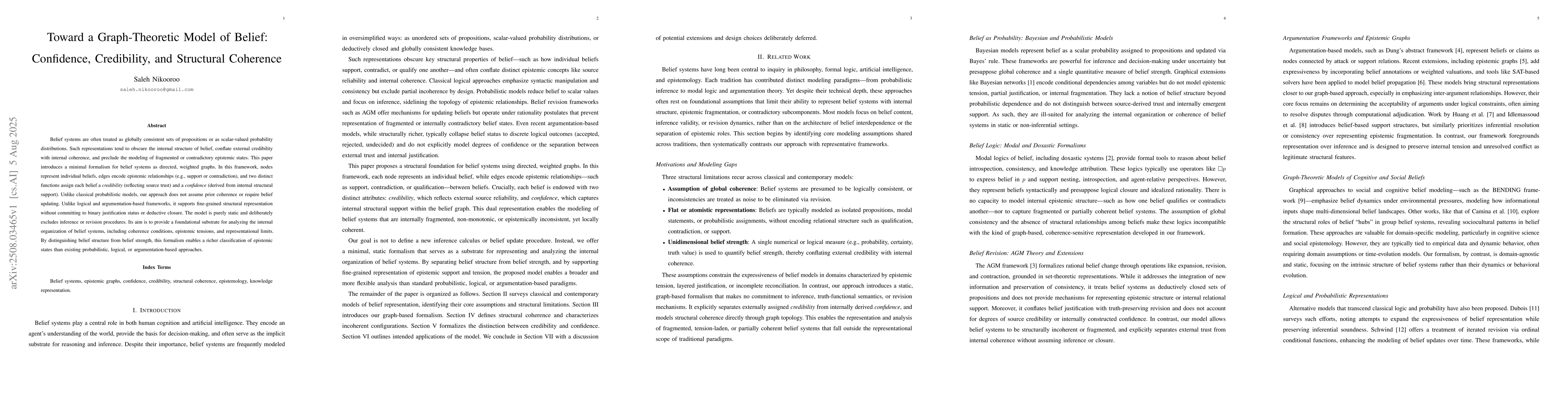 Belief systems are often treated as globally consistent sets of propositions or as scalar-valued probability distributions. Such representations tend to obscure the internal structure of belief, conflate external credibility with internal coherence, and preclude the modeling of fragmented or contradictory epistemic states. This paper introduces a minimal formalism for belief systems as directed, weighted graphs. In this framework, nodes represent individual beliefs, edges encode epistemic relationships (e.g., support or contradiction), and two distinct functions assign each belief a credibility (reflecting source trust) and a confidence (derived from internal structural support). Unlike classical probabilistic models, our approach does not assume prior coherence or require belief updating. Unlike logical and argumentation-based frameworks, it supports fine-grained structural representation without committing to binary justification status or deductive closure. The model is purely static and deliberately excludes inference or revision procedures. Its aim is to provide a foundational substrate for analyzing the internal organization of belief systems, including coherence conditions, epistemic tensions, and representational limits. By distinguishing belief structure from belief strength, this formalism enables a richer classification of epistemic states than existing probabilistic, logical, or argumentation-based approaches.