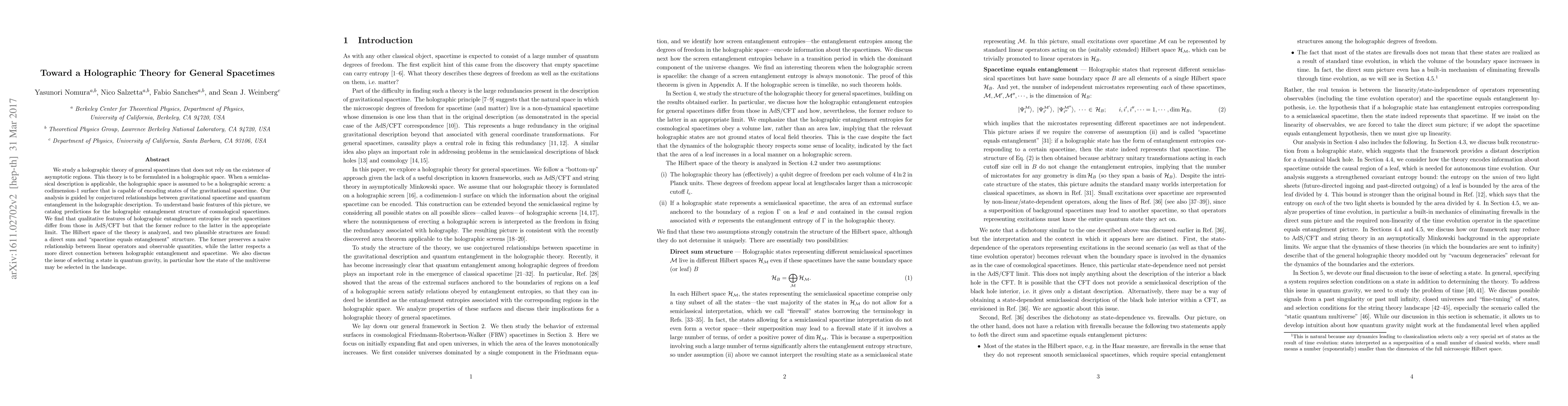 This paper proposes a holographic theory for general spacetimes without relying on asymptotic regions, focusing on a holographic space and screen. It explores the entanglement structure in cosmological spacetimes and identifies two Hilbert space structures, concluding the selection of states in quantum gravity, particularly in the multiverse landscape.