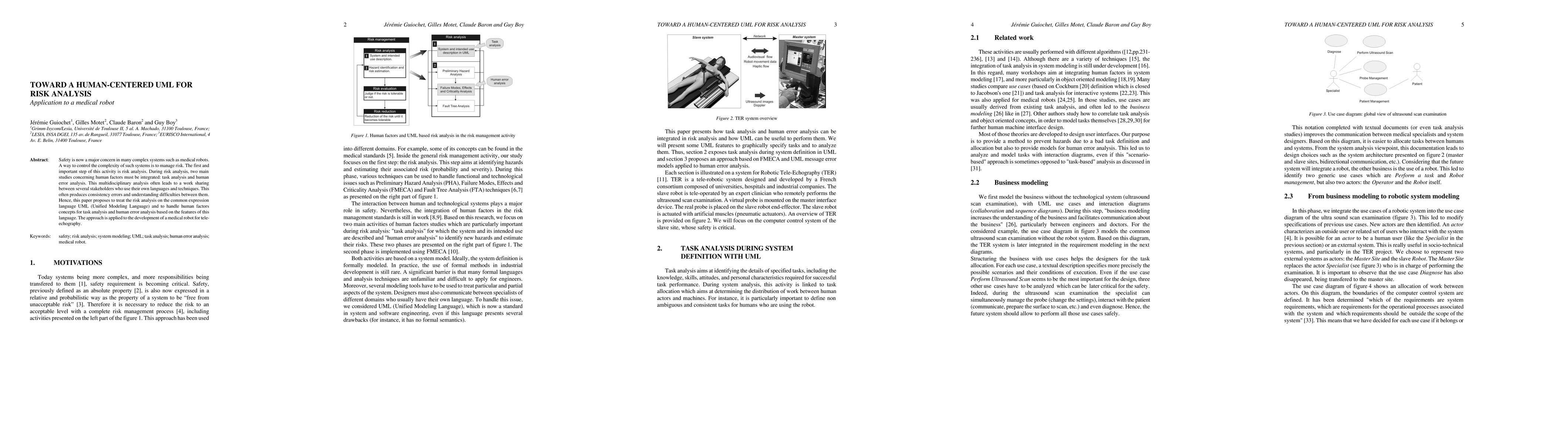This paper proposes using UML to integrate task analysis and human error analysis in risk assessment for complex systems like medical robots, aiming to improve consistency and understanding among stakeholders.