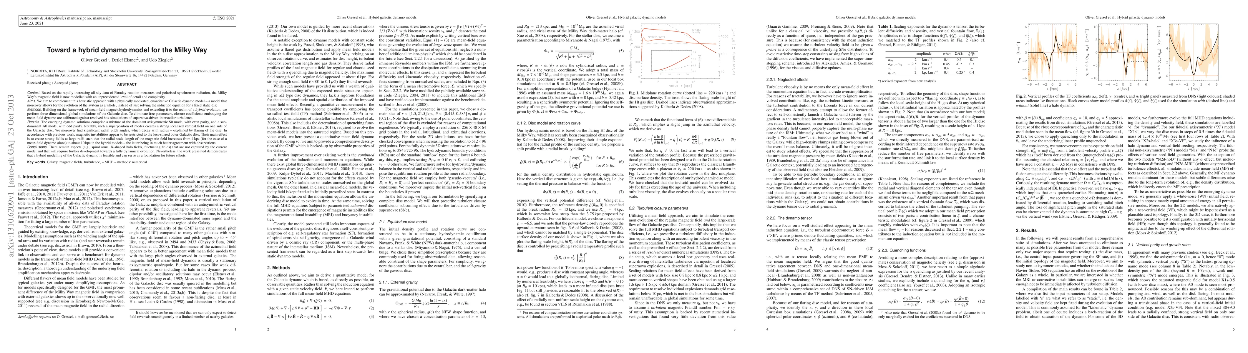 (Abridged) Based on the rapidly increasing all-sky data of Faraday rotation measures and polarised synchrotron radiation, the Milky Way's magnetic field is now modelled with an unprecedented level of detail and complexity. We aim to complement this heuristic approach with a physically motivated, quantitative Galactic dynamo model -- a model that moreover allows for the evolution of the system as a whole, instead of just solving the induction equation for a fixed static disc. Building on the framework of mean-field magnetohydrodynamics and extending it to the realm of a hybrid evolution, we perform three-dimensional global simulations of the Galactic disc. Closure coefficients embodying the mean-field dynamo are calibrated against resolved box simulations of supernova-driven interstellar turbulence. The emerging dynamo solutions comprise a mixture of the dominant axisymmetric S0 mode, with even parity, and a subdominant A0 mode, with odd parity. Notably, such a superposition of modes creates a strong localised vertical field on one side of the Galactic disc. We moreover find significant radial pitch angles, which decay with radius -- explained by flaring of the disc. In accordance with previous work, magnetic instabilities appear to be restricted to the less-stirred outer Galactic disc. Their main effect is to create strong fields at large radii such that the radial scale length of the magnetic field increases from 4 kpc (for the case of a mean-field dynamo alone) to about 10 kpc in the hybrid models. There remain aspects (e.g., spiral arms, X-shaped halo fields, fluctuating fields) that are not captured by the current model and that will require further development towards a fully dynamical evolution. Nevertheless, the work presented demonstrates that a hybrid modelling of the Galactic dynamo is feasible and can serve as a foundation for future efforts.