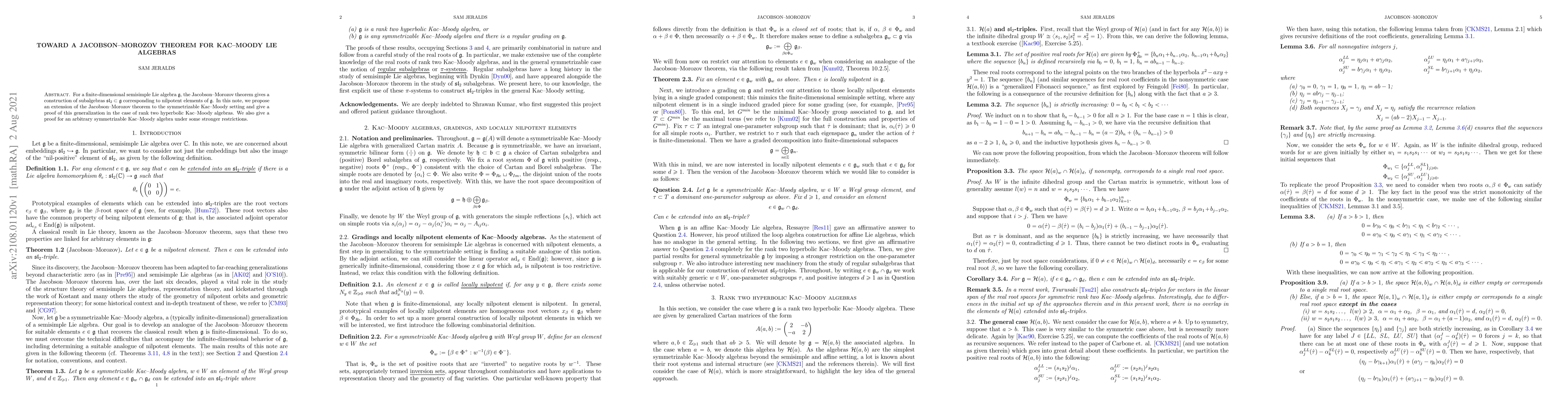 The paper extends the Jacobson--Morozov theorem to symmetrizable Kac--Moody Lie algebras, successfully proving the result for rank two hyperbolic cases and under additional restrictions for general cases.