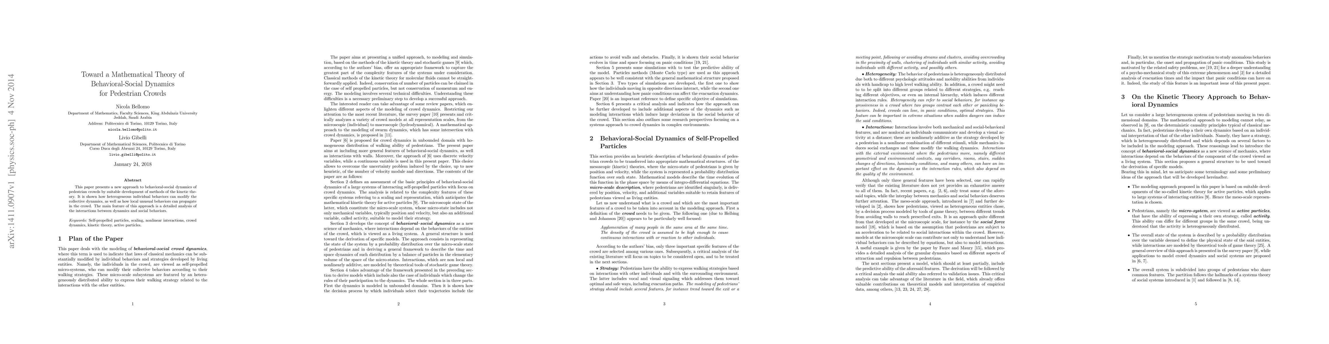 This paper develops a kinetic theory approach to model the behavioral-social dynamics of pedestrian crowds, highlighting how individual behaviors influence collective movement and how unusual local behaviors can spread within the crowd. The focus is on the intricate interactions between social behaviors and crowd dynamics.