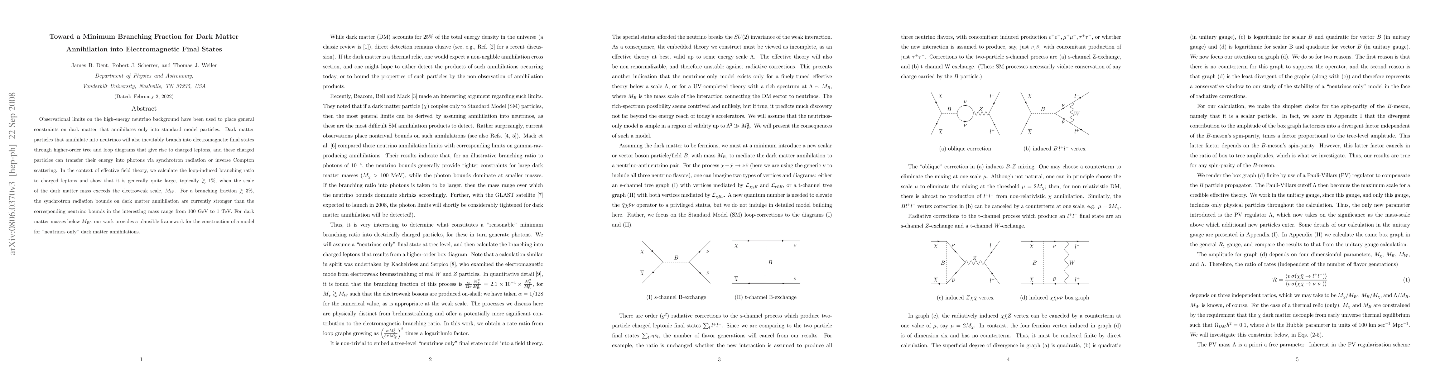 Observational limits on the high-energy neutrino background have been used to place general constraints on dark matter that annihilates only into standard model particles. Dark matter particles that annihilate into neutrinos will also inevitably branch into electromagnetic final states through higher-order tree and loop diagrams that give rise to charged leptons, and these charged particles can transfer their energy into photons via synchrotron radiation or inverse Compton scattering. In the context of effective field theory, we calculate the loop-induced branching ratio to charged leptons and show that it is generally quite large, typically >1%, when the scale of the dark matter mass exceeds the electroweak scale, M_W. For a branching fraction >3%, the synchrotron radiation bounds on dark matter annihilation are currently stronger than the corresponding neutrino bounds in the interesting mass range from 100 GeV to 1 TeV. For dark matter masses below M_W, our work provides a plausible framework for the construction of a model for "neutrinos only" dark matter annihilations.