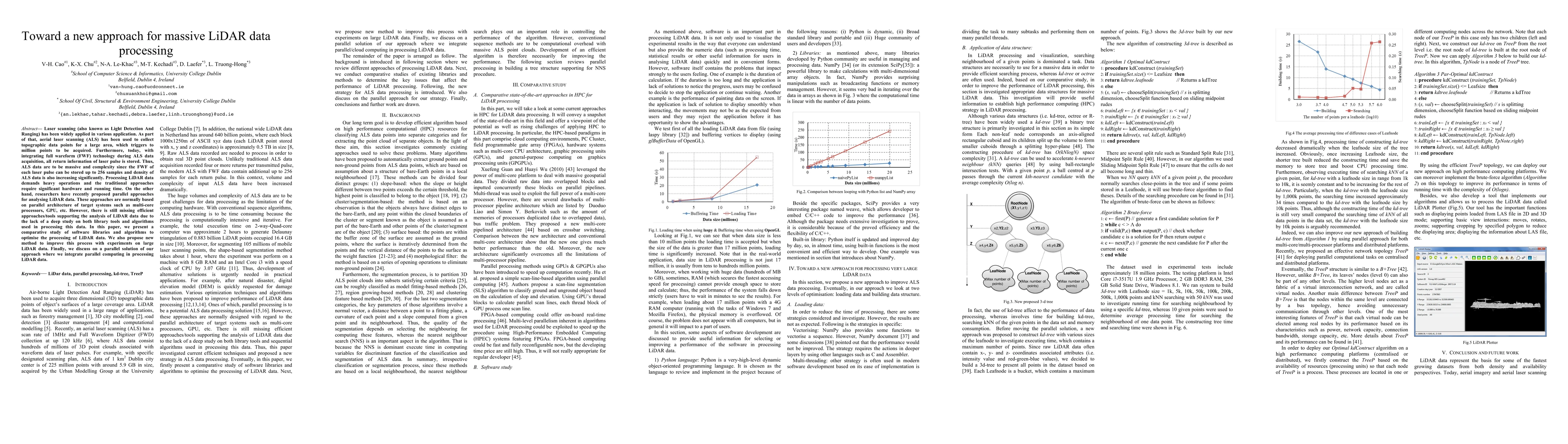 Laser scanning (also known as Light Detection And Ranging) has been widely applied in various application. As part of that, aerial laser scanning (ALS) has been used to collect topographic data points for a large area, which triggers to million points to be acquired. Furthermore, today, with integrating full wareform (FWF) technology during ALS data acquisition, all return information of laser pulse is stored. Thus, ALS data are to be massive and complexity since the FWF of each laser pulse can be stored up to 256 samples and density of ALS data is also increasing significantly. Processing LiDAR data demands heavy operations and the traditional approaches require significant hardware and running time. On the other hand, researchers have recently proposed parallel approaches for analysing LiDAR data. These approaches are normally based on parallel architecture of target systems such as multi-core processors, GPU, etc. However, there is still missing efficient approaches/tools supporting the analysis of LiDAR data due to the lack of a deep study on both library tools and algorithms used in processing this data. In this paper, we present a comparative study of software libraries and algorithms to optimise the processing of LiDAR data. We also propose new method to improve this process with experiments on large LiDAR data. Finally, we discuss on a parallel solution of our approach where we integrate parallel computing in processing LiDAR data.