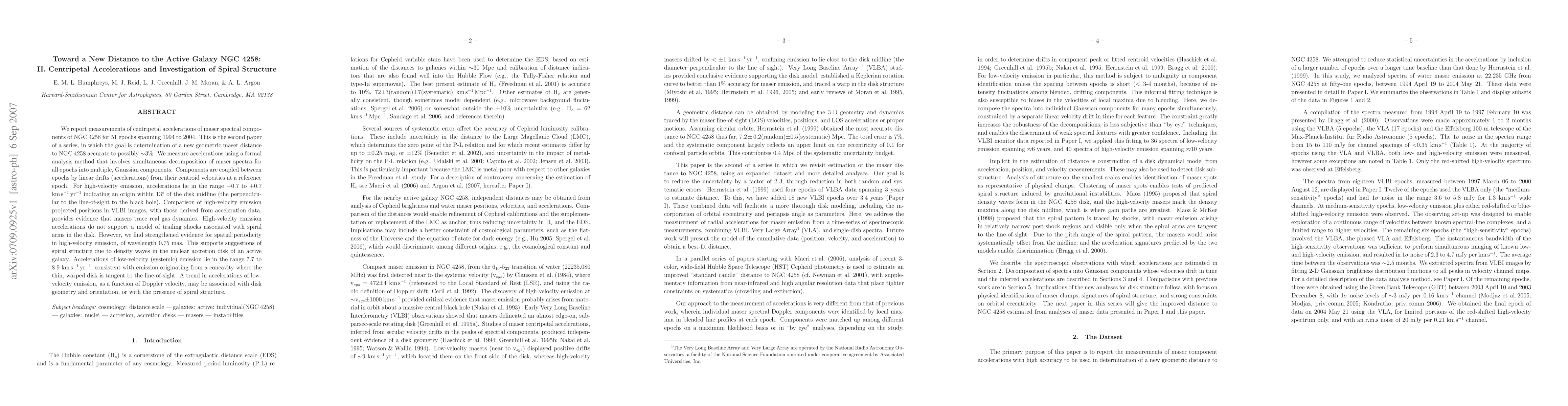 We report measurements of centripetal accelerations of maser spectral components of NGC 4258 for 51 epochs spanning 1994 to 2004. This is the second paper of a series, in which the goal is determination of a new geometric maser distance to NGC 4258 accurate to possibly ~3%. We measure accelerations using a formal analysis method that involves simultaneous decomposition of maser spectra for all epochs into multiple, Gaussian components. Components are coupled between epochs by linear drifts (accelerations) from their centroid velocities at a reference epoch. For high-velocity emission, accelerations lie in the range -0.7 to +0.7 km/s/yr indicating an origin within 13 degrees of the disk midline (the perpendicular to the line-of-sight to the black hole). Comparison of high-velocity emission projected positions in VLBI images, with those derived from acceleration data, provides evidence that masers trace real gas dynamics. High-velocity emission accelerations do not support a model of trailing shocks associated with spiral arms in the disk. However, we find strengthened evidence for spatial periodicity in high-velocity emission, of wavelength 0.75 mas. This supports suggestions of spiral structure due to density waves in the nuclear accretion disk of an active galaxy. Accelerations of low-velocity (systemic) emission lie in the range 7.7 to 8.9 km/s/yr, consistent with emission originating from a concavity where the thin, warped disk is tangent to the line-of-sight. A trend in accelerations of low-velocity emission as a function of Doppler velocity may be associated with disk geometry and orientation, or with the presence of spiral structure.