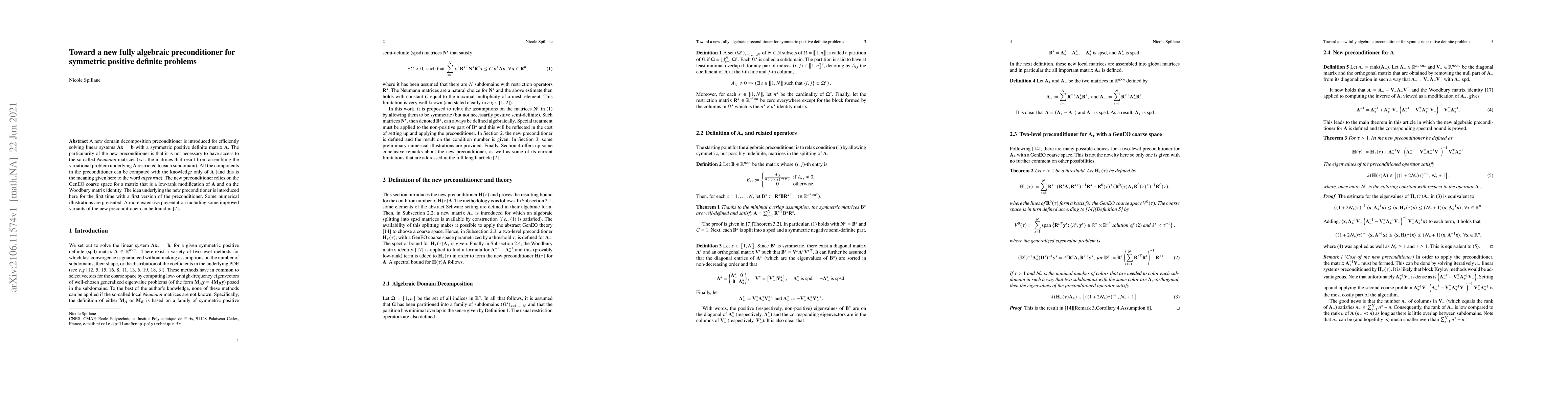 This paper introduces a novel algebraic preconditioner for solving symmetric positive definite linear systems without needing Neumann matrices, relying solely on matrix A and using GenEO coarse space and the Woodbury identity. Initial numerical results demonstrate its potential, with more refined versions discussed in a forthcoming extended version.