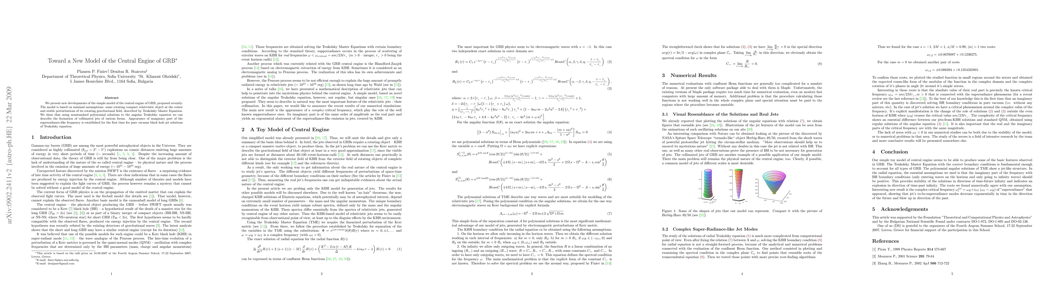 We present new developments of the simple model of the central engine of GRB, proposed recently. The model is based on minimal assumptions: some rotating compact relativistic object at the center and stable perturbations of its rotating gravitational field, described by Teukolsky Master Equation. We show that using nonstandard polynomial solutions to the angular Teukolsky equation we can describe the formation of collimated jets of various forms. Appearance of imaginary part of the superradiance-like frequency is established for the first time for pure vacuum black hole jet solutions of Teukolsky equation.