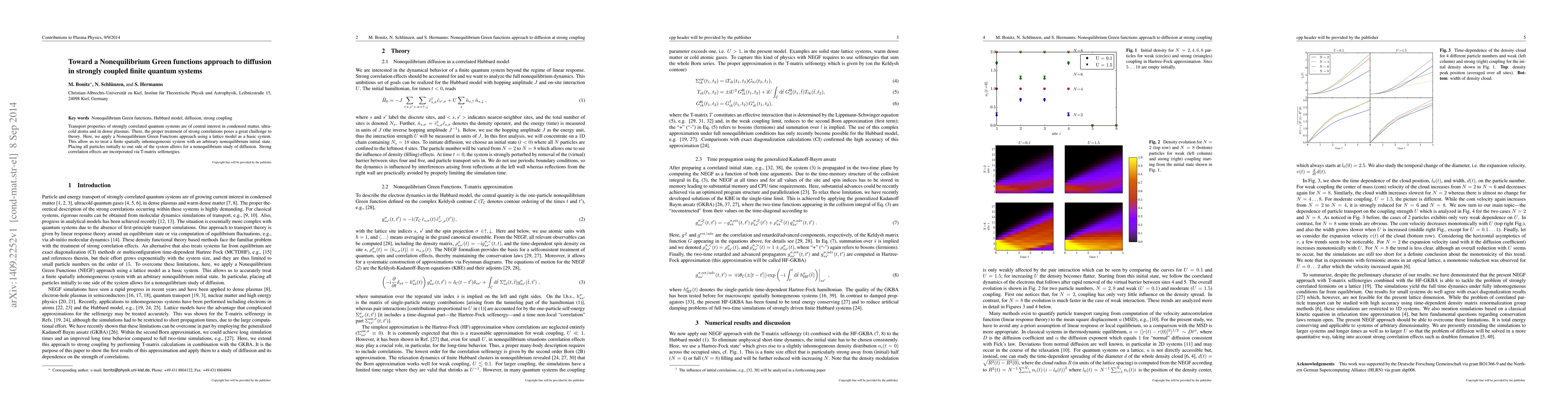 Transport properties of strongly correlated quantum systems are of central interest in condensed matter, ultracold atoms and in dense plasmas. There, the proper treatment of strong correlations poses a great challenge to theory. Here, we apply a Nonequilibrium Green Functions approach using a lattice model as a basic system. This allow us to treat a finite spatially inhomogeneous system with an arbitrary nonequilibrium initial state. Placing all particles initially to one side of the system allows for a nonequilibrium study of diffusion. Strong correlation effects are incorporated via T-matrix selfenergies.