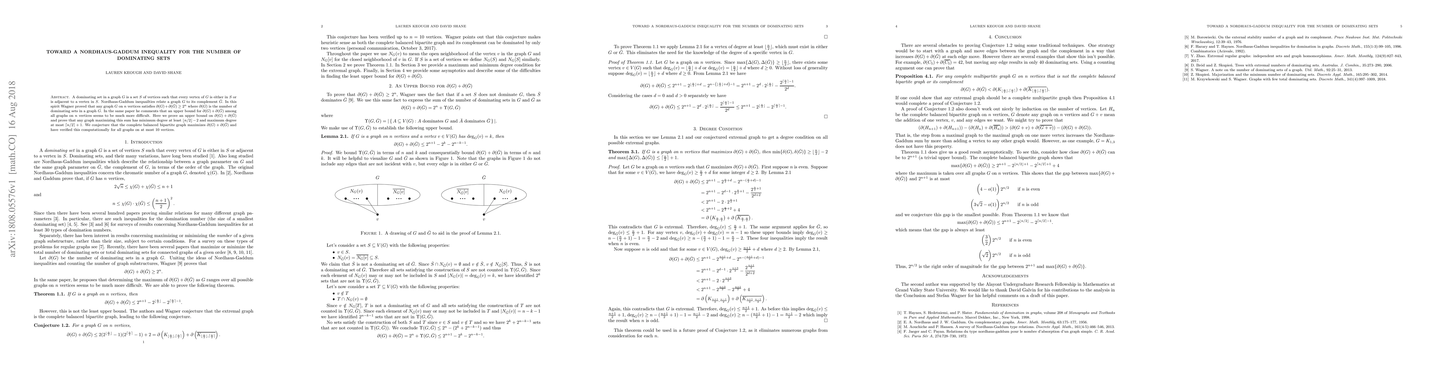 A dominating set in a graph $G$ is a set $S$ of vertices such that every vertex of $G$ is either in $S$ or is adjacent to a vertex in $S$. Nordhaus-Gaddum inequailties relate a graph $G$ to its complement $\bar{G}$. In this spirit Wagner proved that any graph $G$ on $n$ vertices satisfies $\partial(G)+\partial(\bar{G})\geq 2^n$ where $\partial(G)$ is the number of dominating sets in a graph $G$. In the same paper he comments that an upper bound for $\partial(G)+\partial(\bar{G})$ among all graphs on $n$ vertices seems to be much more difficult. Here we prove an upper bound on $\partial(G)+\partial(\bar{G})$ and prove that any graph maximizing this sum has minimum degree at least $\lfloor n/2\rfloor-2$ and maximum degree at most $\lfloor n/2\rfloor+1$. We conjecture that the complete balanced bipartite graph maximizes $\partial(G)+\partial(\bar{G})$ and have verified this computationally for all graphs on at most $10$ vertices.