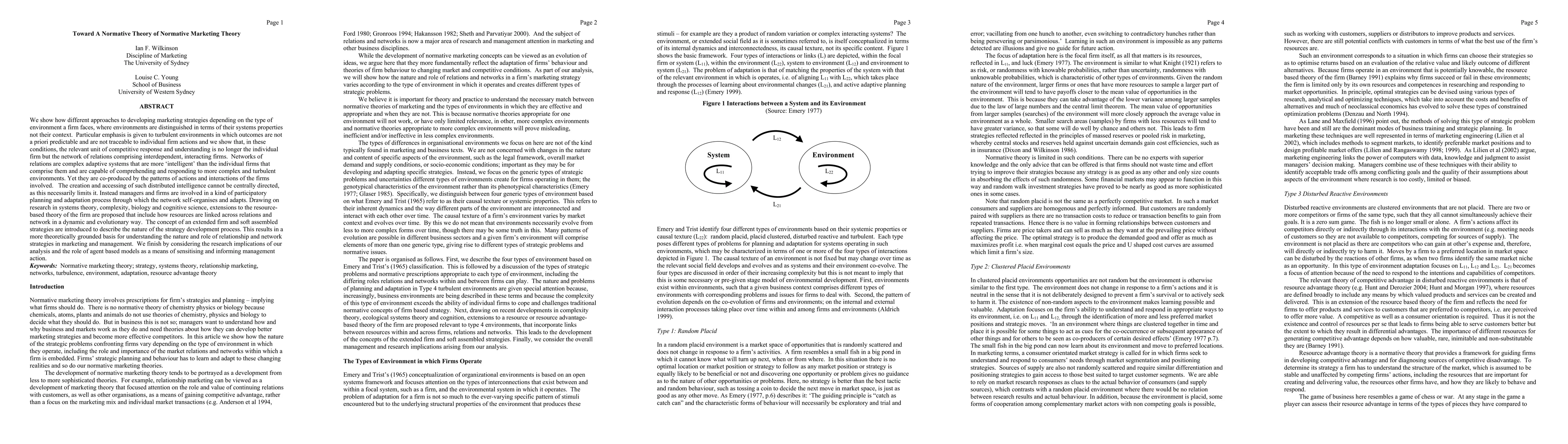 We show how different approaches to developing marketing strategies depending on the type of environment a firm faces, where environments are distinguished in terms of their systems properties not their context. Particular emphasis is given to turbulent environments in which outcomes are not a priori predictable and are not traceable to individual firm actions and we show that, in these conditions, the relevant unit of competitive response and understanding is no longer the individual firm but the network of relations comprising interdependent, interacting firms. Networks of relations are complex adaptive systems that are more 'intelligent' than the individual firms that comprise them and are capable of comprehending and responding to more complex and turbulent environments. Yet they are co-produced by the patterns of actions and interactions of the firms involved. The creation and accessing of such distributed intelligence cannot be centrally directed, as this necessarily limits it. Instead managers and firms are involved in a kind of participatory planning and adaptation process through which the network self-organises and adapts. Drawing on research in systems theory, complexity, biology and cognitive science, extensions to the resource-based theory of the firm are proposed that include how resources are linked across relations and network in a dynamic and evolutionary way. The concept of an extended firm and soft assembled strategies are introduced to describe the nature of the strategy development process. This results in a more theoretically grounded basis for understanding the nature and role of relationship and network strategies in marketing and management. We finish by considering the research implications of our analysis and the role of agent based models as a means of sensitising and informing management action.