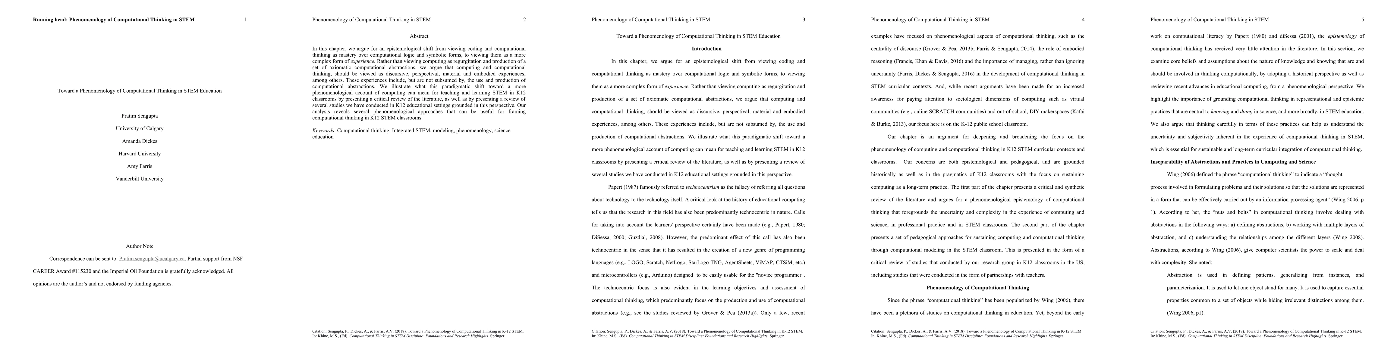 In this chapter, we argue for an epistemological shift from viewing coding and computational thinking as mastery over computational logic and symbolic forms, to viewing them as a more complex form of experience. Rather than viewing computing as regurgitation and production of a set of axiomatic computational abstractions, we argue that computing and computational thinking, should be viewed as discursive, perspectival, material and embodied experiences, among others. These experiences include, but are not subsumed by, the use and production of computational abstractions. We illustrate what this paradigmatic shift toward a more phenomenological account of computing can mean for teaching and learning STEM in K12 classrooms by presenting a critical review of the literature, as well as by presenting a review of several studies we have conducted in K12 educational settings grounded in this perspective. Our analysis reveals several phenomenological approaches that can be useful for framing computational thinking in K12 STEM classrooms.