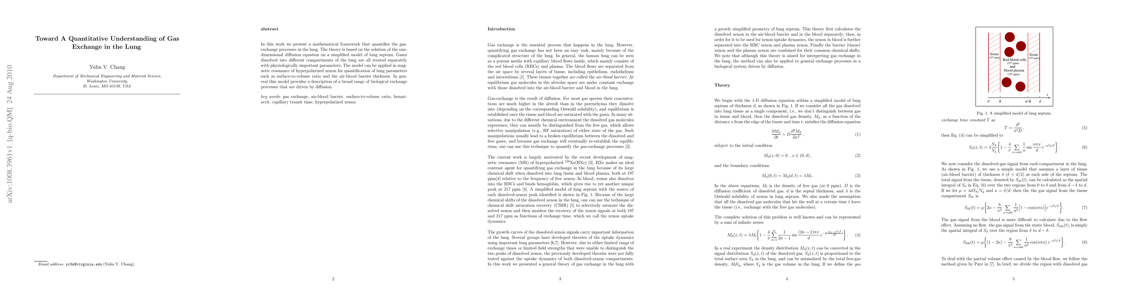 This paper develops a mathematical framework to quantify gas exchange in the lung using a simplified model of lung septum and the one-dimensional diffusion equation. The model can be applied to magnetic resonance imaging to measure lung parameters like surface-to-volume ratio and air-blood barrier thickness.