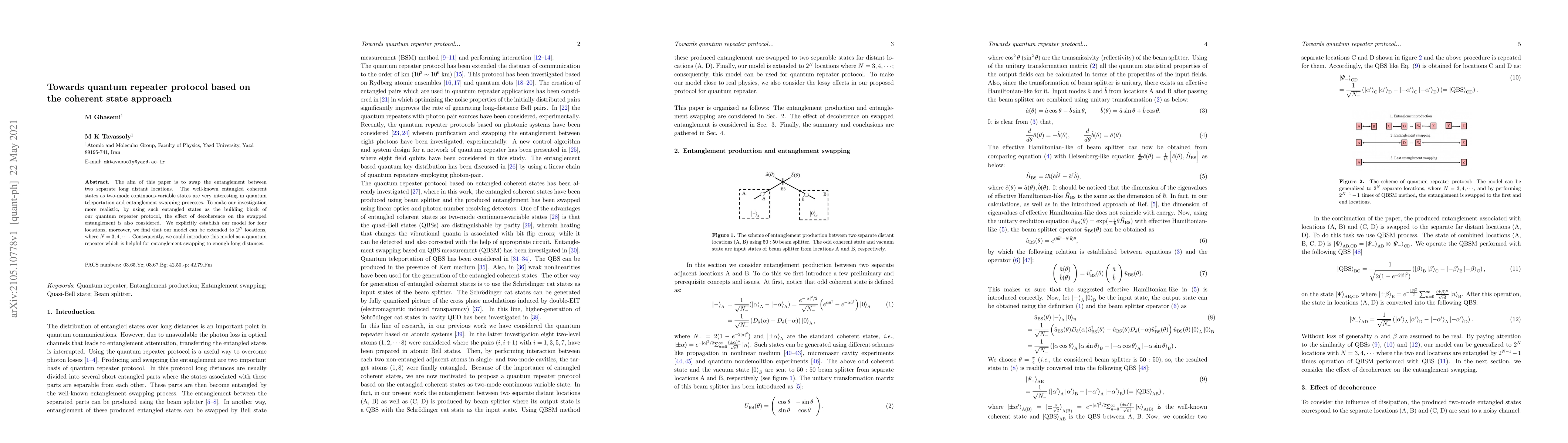 This paper proposes a quantum repeater protocol based on entangled coherent states for swapping entanglement over long distances, considering decoherence effects. The model is demonstrated for four locations and can be extended to 2N locations, suggesting its potential for long-distance entanglement swapping.