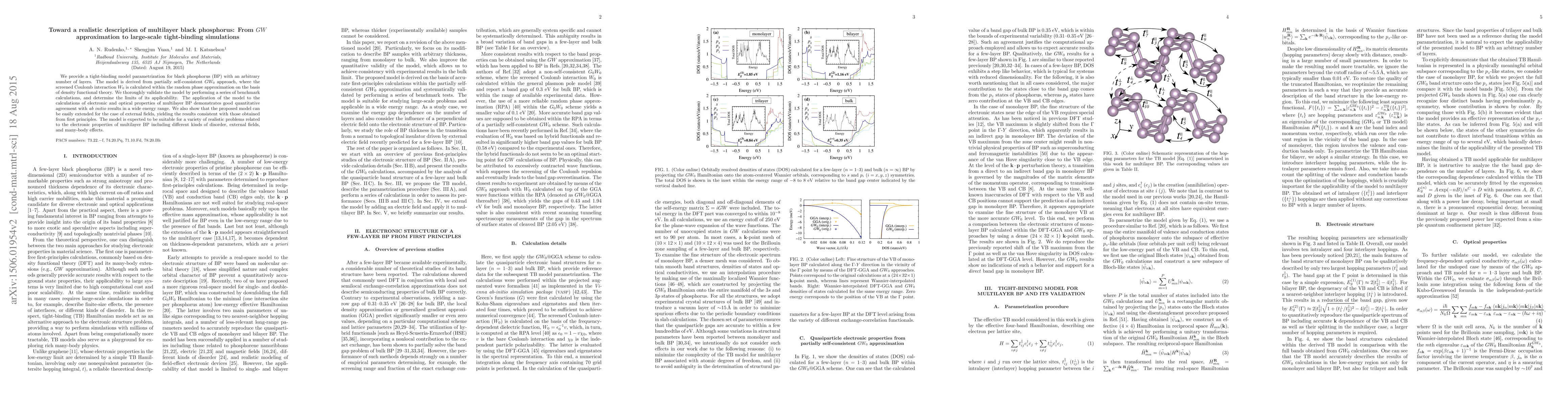 This paper presents a tight-binding model for multilayer black phosphorus derived from the $GW_0$ approximation, validated through benchmark calculations, and demonstrates good agreement with ab initio results for electronic and optical properties. The model is extendable for various realistic conditions including external fields and disorder.