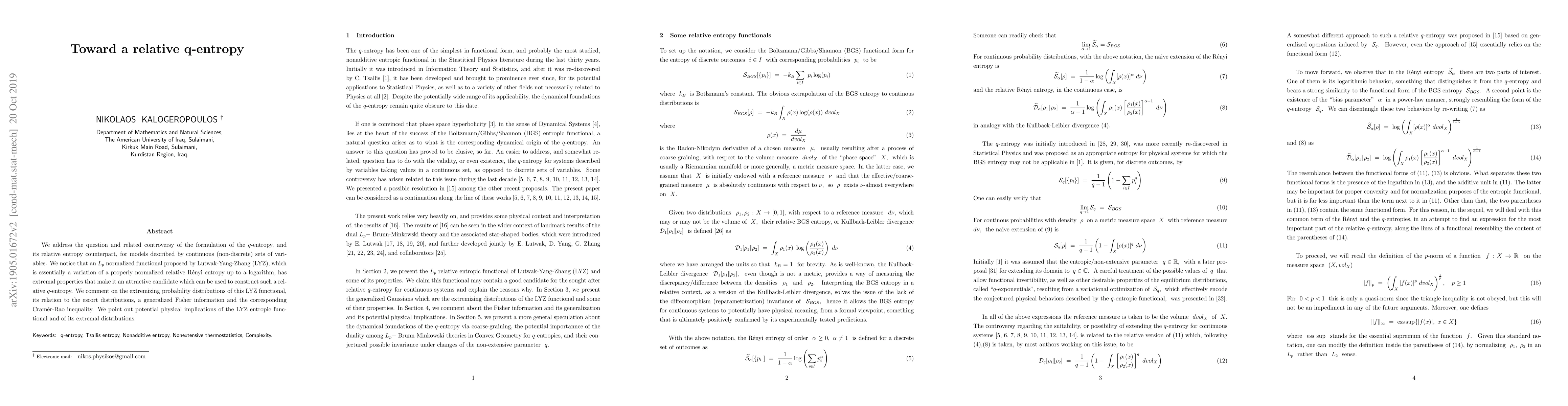 We address the question and related controversy of the formulation of the $q$-entropy, and its relative entropy counterpart, for models described by continuous (non-discrete) sets of variables. We notice that an $L_p$ normalized functional proposed by Lutwak-Yang-Zhang (LYZ), which is essentially a variation of a properly normalized relative R\'{e}nyi entropy up to a logarithm, has extremal properties that make it an attractive candidate which can be used to construct such a relative $q$-entropy. We comment on the extremizing probability distributions of this LYZ functional, its relation to the escort distributions, a generalized Fisher information and the corresponding Cram\'{e}r-Rao inequality. We point out potential physical implications of the LYZ entropic functional and of its extremal distributions.
