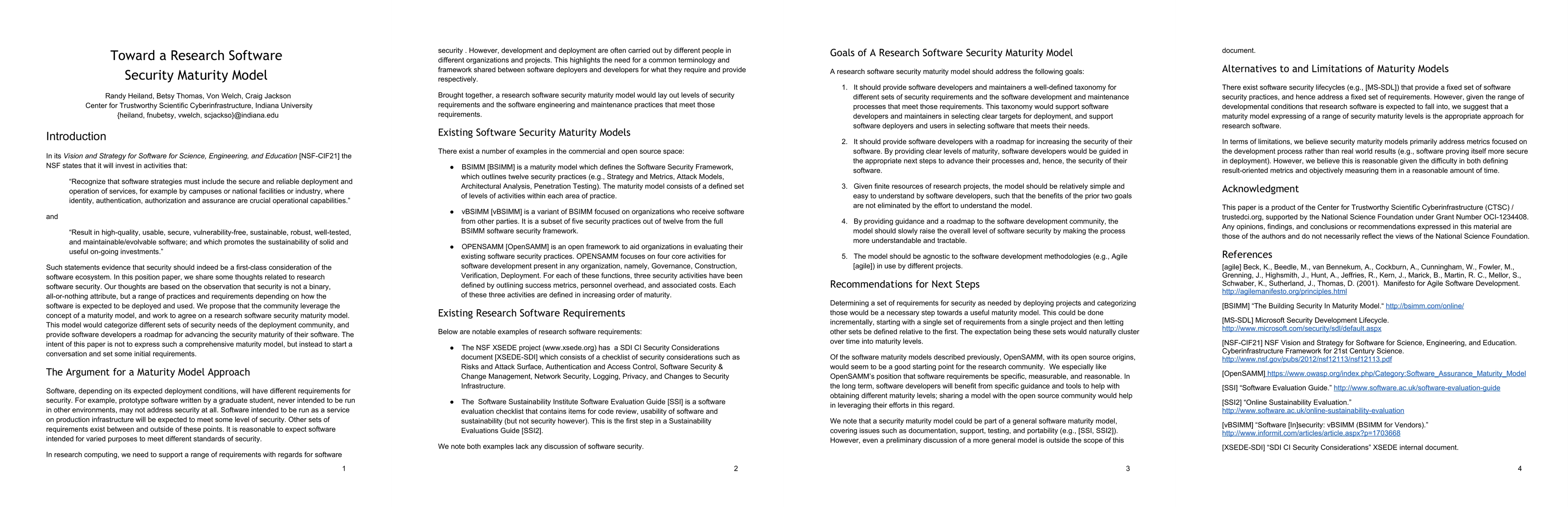 In its Vision and Strategy for Software for Science, Engineering, and Education the NSF states that it will invest in activities that: "Recognize that software strategies must include the secure and reliable deployment and operation of services, for example by campuses or national facilities or industry, where identity, authentication, authorization and assurance are crucial operational capabilities." and "Result in high-quality, usable, secure, vulnerability-free, sustainable, robust, well-tested, and maintainable/evolvable software; and which promotes the sustainability of solid and useful on-going investments." Such statements evidence that security should indeed be a first-class consideration of the software ecosystem. In this position paper, we share some thoughts related to research software security. Our thoughts are based on the observation that security is not a binary, all-or-nothing attribute, but a range of practices and requirements depending on how the software is expected to be deployed and used. We propose that the community leverage the concept of a maturity model, and work to agree on a research software security maturity model. This model would categorize different sets of security needs of the deployment community, and provide software developers a roadmap for advancing the security maturity of their software. The intent of this paper is not to express such a comprehensive maturity model, but instead to start a conversation and set some initial requirements.