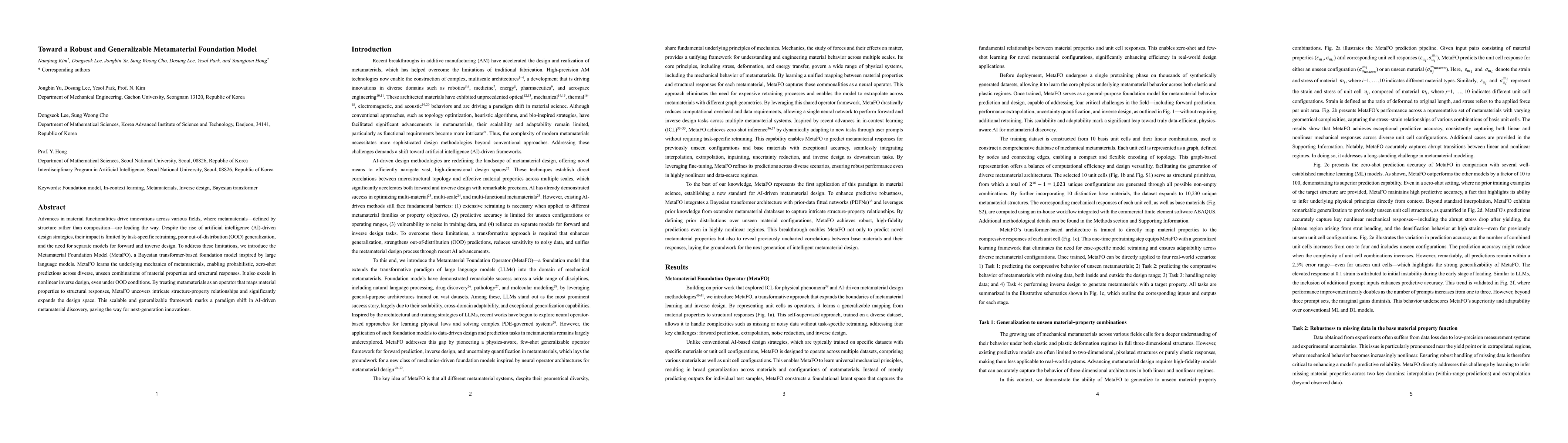Advances in material functionalities drive innovations across various fields, where metamaterials-defined by structure rather than composition-are leading the way. Despite the rise of artificial intelligence (AI)-driven design strategies, their impact is limited by task-specific retraining, poor out-of-distribution(OOD) generalization, and the need for separate models for forward and inverse design. To address these limitations, we introduce the Metamaterial Foundation Model (MetaFO), a Bayesian transformer-based foundation model inspired by large language models. MetaFO learns the underlying mechanics of metamaterials, enabling probabilistic, zero-shot predictions across diverse, unseen combinations of material properties and structural responses. It also excels in nonlinear inverse design, even under OOD conditions. By treating metamaterials as an operator that maps material properties to structural responses, MetaFO uncovers intricate structure-property relationships and significantly expands the design space. This scalable and generalizable framework marks a paradigm shift in AI-driven metamaterial discovery, paving the way for next-generation innovations.