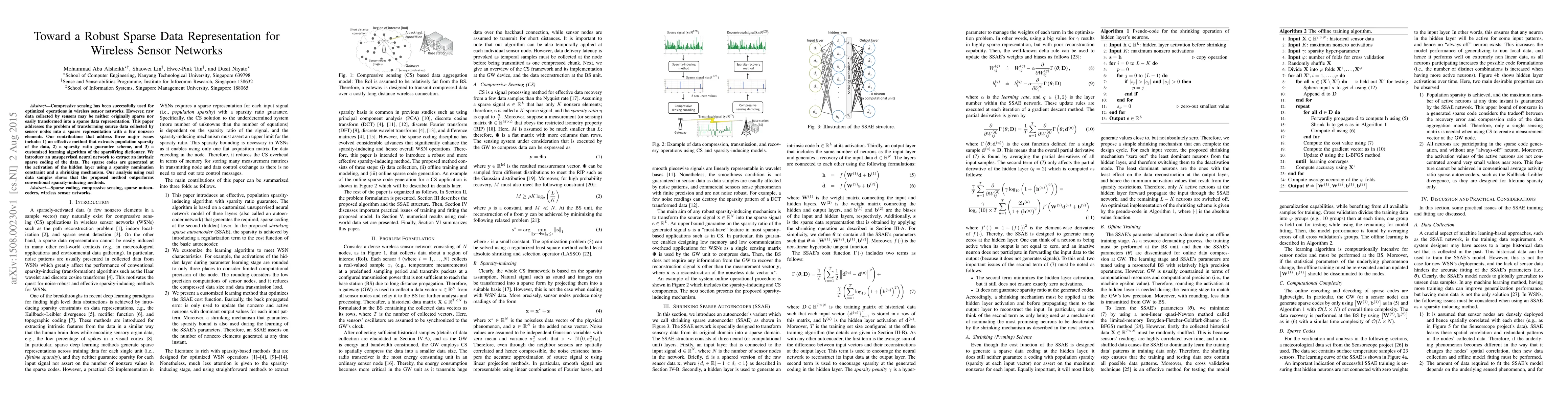 This paper proposes a method to transform raw sensor data into a sparse representation for wireless sensor networks using compressive sensing. It introduces an unsupervised neural network to extract sparse coding, ensuring a sparsity ratio guarantee and a customized learning algorithm for the sparsifying dictionary, outperforming conventional methods.