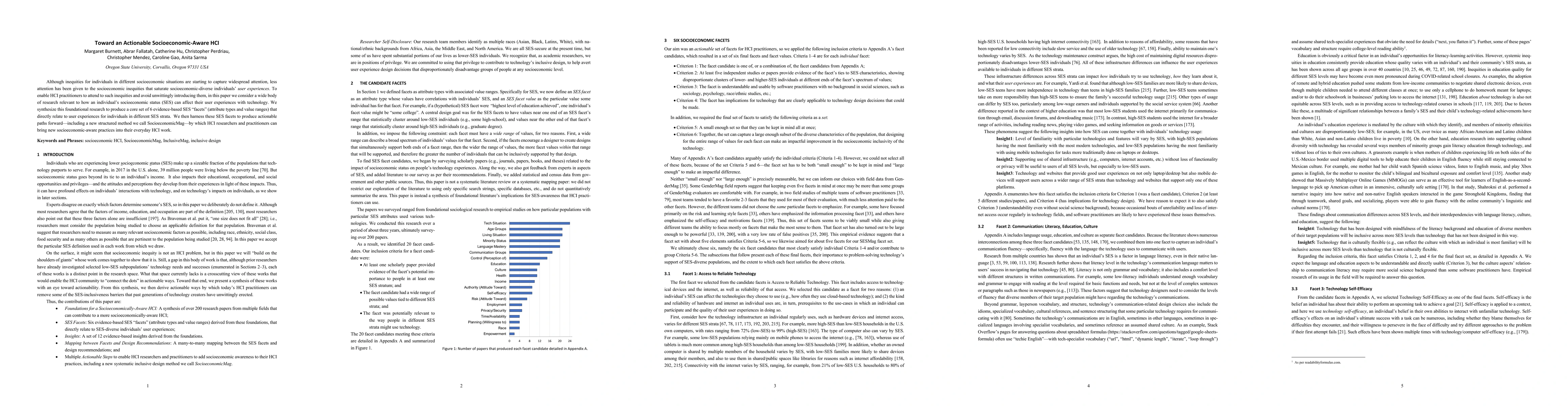 This paper highlights the lack of attention to socioeconomic inequities in technology user experiences and proposes five key 'facets' or attribute types of socioeconomic status that impact user interactions. It aims to guide HCI researchers and practitioners in integrating socioeconomic awareness into Human-Computer Interaction design.