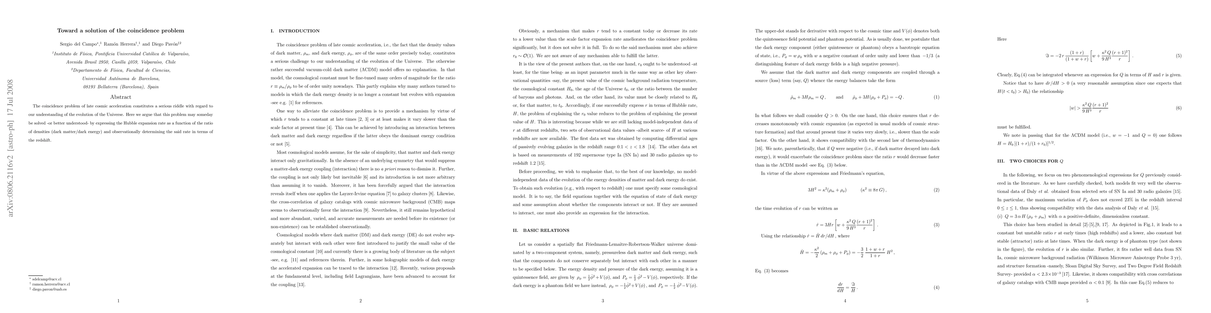 The paper proposes a novel approach to solving the coincidence problem of late cosmic acceleration by linking the Hubble expansion rate to the ratio of dark matter to dark energy densities, suggesting observational determination of this rate via redshift measurements may offer insights.