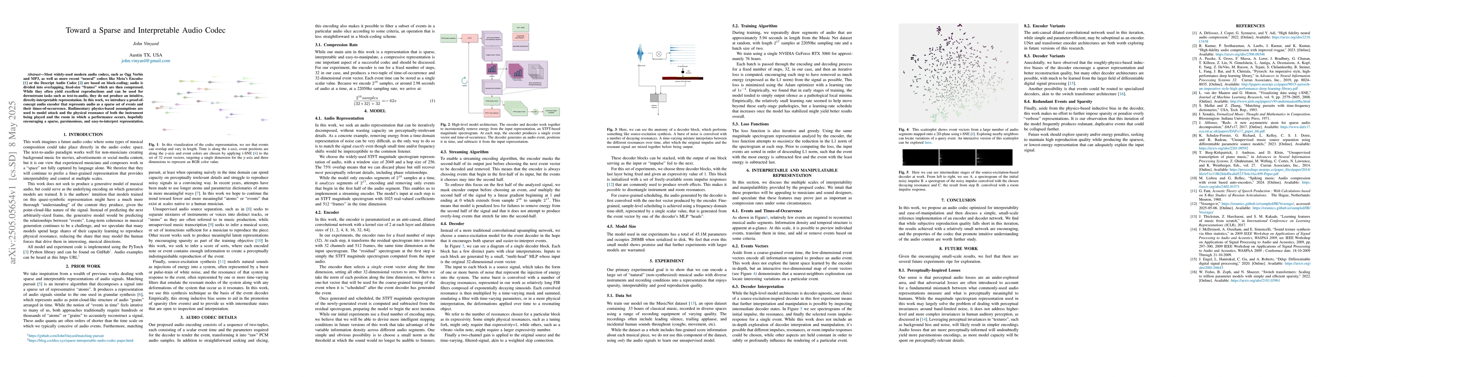 Most widely-used modern audio codecs, such as Ogg Vorbis and MP3, as well as more recent "neural" codecs like Meta's Encodec or the Descript Audio Codec are based on block-coding; audio is divided into overlapping, fixed-size "frames" which are then compressed. While they often yield excellent reproductions and can be used for downstream tasks such as text-to-audio, they do not produce an intuitive, directly-interpretable representation. In this work, we introduce a proof-of-concept audio encoder that represents audio as a sparse set of events and their times-of-occurrence. Rudimentary physics-based assumptions are used to model attack and the physical resonance of both the instrument being played and the room in which a performance occurs, hopefully encouraging a sparse, parsimonious, and easy-to-interpret representation.