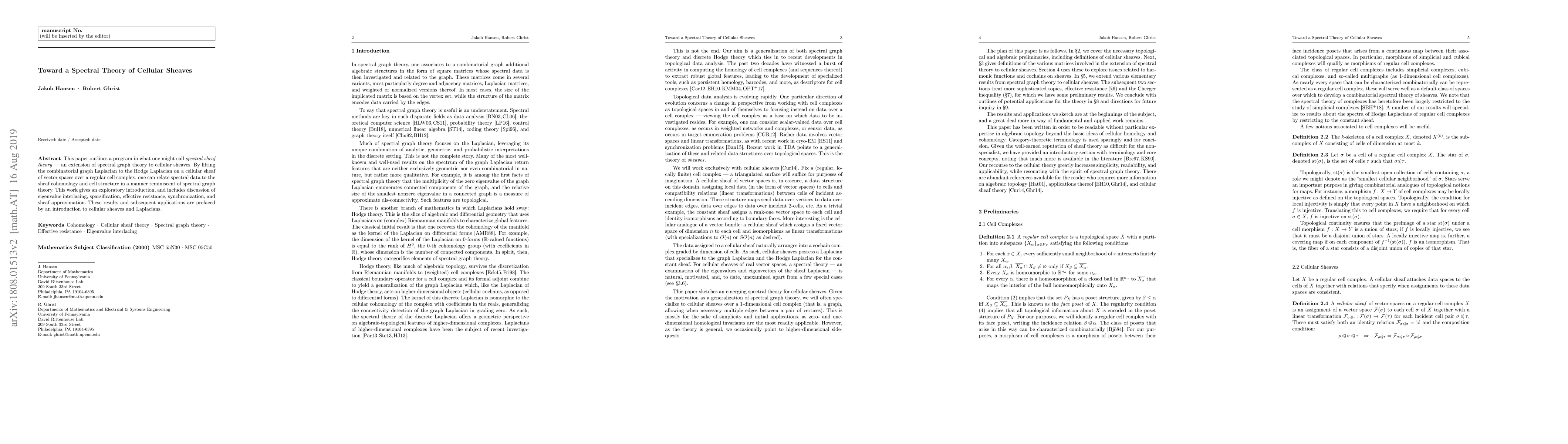 This paper outlines a program in what one might call spectral sheaf theory --- an extension of spectral graph theory to cellular sheaves. By lifting the combinatorial graph Laplacian to the Hodge Laplacian on a cellular sheaf of vector spaces over a regular cell complex, one can relate spectral data to the sheaf cohomology and cell structure in a manner reminiscent of spectral graph theory. This work gives an exploratory introduction, and includes results on eigenvalue interlacing, sparsification, effective resistance, and sheaf approximation. These results and subsequent applications are prefaced by an introduction to cellular sheaves and Laplacians.