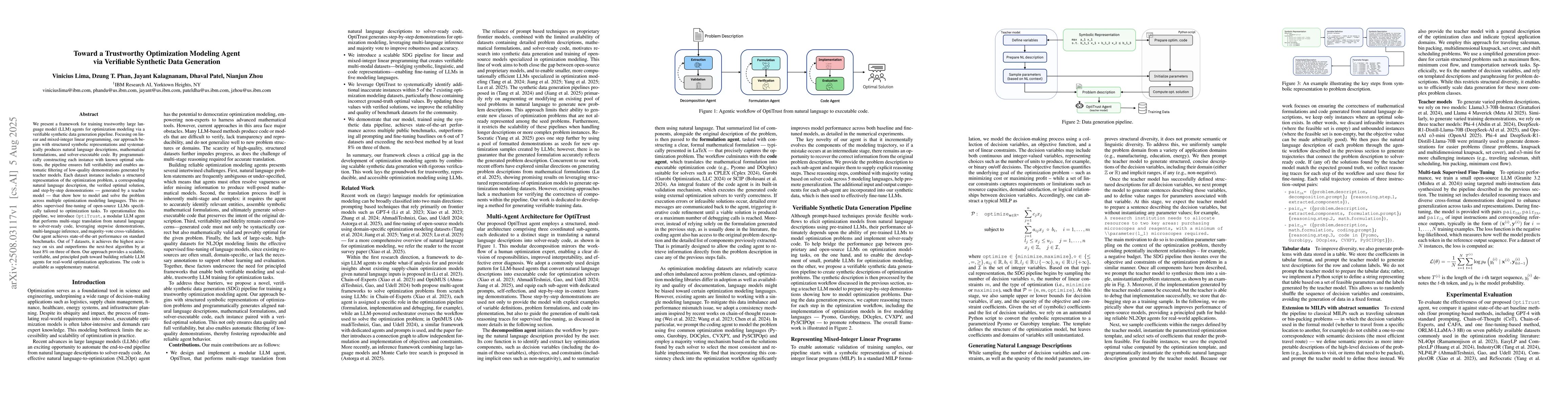 We present a framework for training trustworthy large language model (LLM) agents for optimization modeling via a verifiable synthetic data generation pipeline. Focusing on linear and mixed-integer linear programming, our approach begins with structured symbolic representations and systematically produces natural language descriptions, mathematical formulations, and solver-executable code. By programmatically constructing each instance with known optimal solutions, the pipeline ensures full verifiability and enables automatic filtering of low-quality demonstrations generated by teacher models. Each dataset instance includes a structured representation of the optimization problem, a corresponding natural language description, the verified optimal solution, and step-by-step demonstrations - generated by a teacher model - that show how to model and solve the problem across multiple optimization modeling languages. This enables supervised fine-tuning of open-source LLMs specifically tailored to optimization tasks. To operationalize this pipeline, we introduce OptiTrust, a modular LLM agent that performs multi-stage translation from natural language to solver-ready code, leveraging stepwise demonstrations, multi-language inference, and majority-vote cross-validation. Our agent achieves state-of-the-art performance on standard benchmarks. Out of 7 datasets, it achieves the highest accuracy on six and outperforms the next-best algorithm by at least 8 percentage on three of them. Our approach provides a scalable, verifiable, and principled path toward building reliable LLM agents for real-world optimization applications.