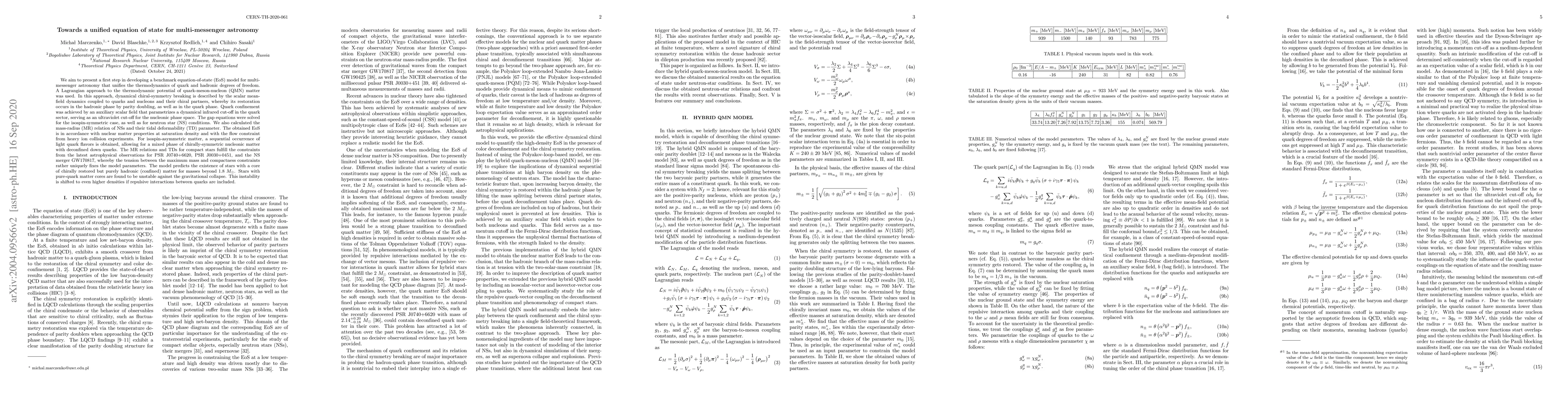 We present a first step in developing a benchmark equation-of-state (EoS) model for multi-messenger astronomy that unifies the thermodynamics of quark and hadronic degrees of freedom. A Lagrangian approach to the thermodynamic potential of quark-meson-nucleon (QMN) matter was used. In this approach, dynamical chiral-symmetry breaking is described by the scalar mean-field dynamics coupled to quarks and nucleons and their chiral partners, whereby its restoration occurs in the hadronic phase by parity doubling, as well as in the quark phase. Quark confinement was achieved by an auxiliary scalar field that parametrizes a dynamical infrared cutoff in the quark sector, serving as an ultraviolet cutoff for the nucleonic phase space. The gap equations were solved for the isospin-symmetric case, as well as for neutron star (NS) conditions. We also calculated the mass-radius (MR) relation of NSs and their tidal deformability parameter. The obtained EoS is in accordance with nuclear matter properties at saturation density and with the flow constraint from heavy ion collision experiments. For isospin-asymmetric matter, a sequential occurrence of light quark flavors is obtained, allowing for a mixed phase of chirally-symmetric nucleonic matter with deconfined down quarks. The MR relations and TDs for compact stars fulfill the constraints from the latest astrophysical observations for PSR J0740+6620, PSR J0030+0451, and the NS merger GW170817, whereby the tension between the maximum mass and compactness constraints rather uniquely fixes the model parameters. The model predicts the existence of stars with a core of chirally restored but purely hadronic (confined) matter for masses beyond $1.8~M_\odot$. Stars with pure-quark matter cores are found to be unstable against the gravitational collapse. This instability is shifted to even higher densities if repulsive interactions between quarks are included.
