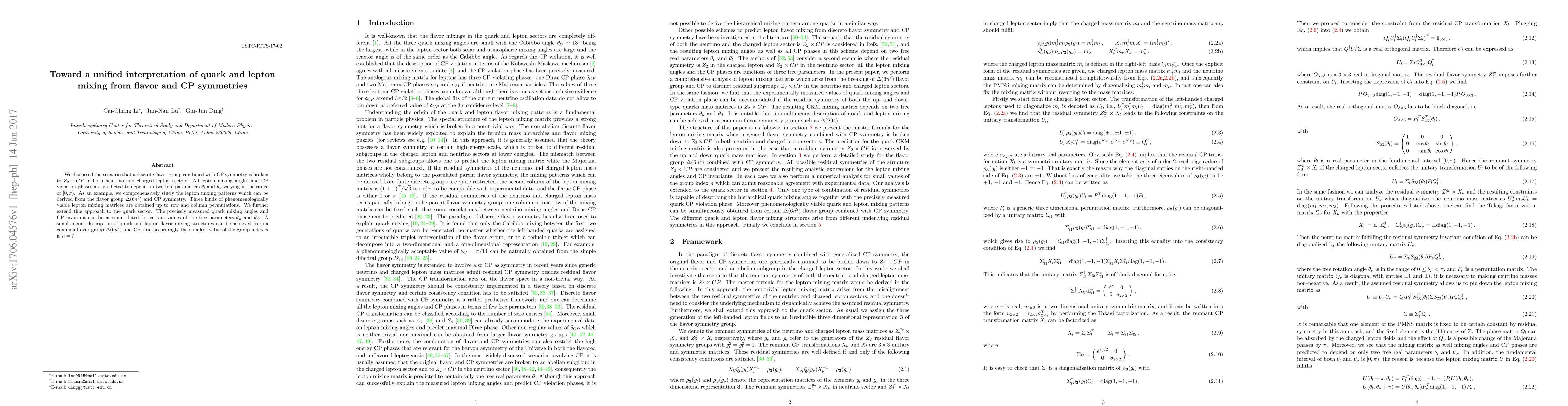 This paper proposes a unified framework for interpreting quark and lepton mixing using a discrete flavor group combined with CP symmetry, predicting all mixing angles and CP violation phases through two free parameters. It demonstrates this approach using the $\Delta(6n^2)$ flavor group, achieving viable lepton mixing patterns and extending the method to accommodate quark mixing, with $n=7$ being the smallest group index.