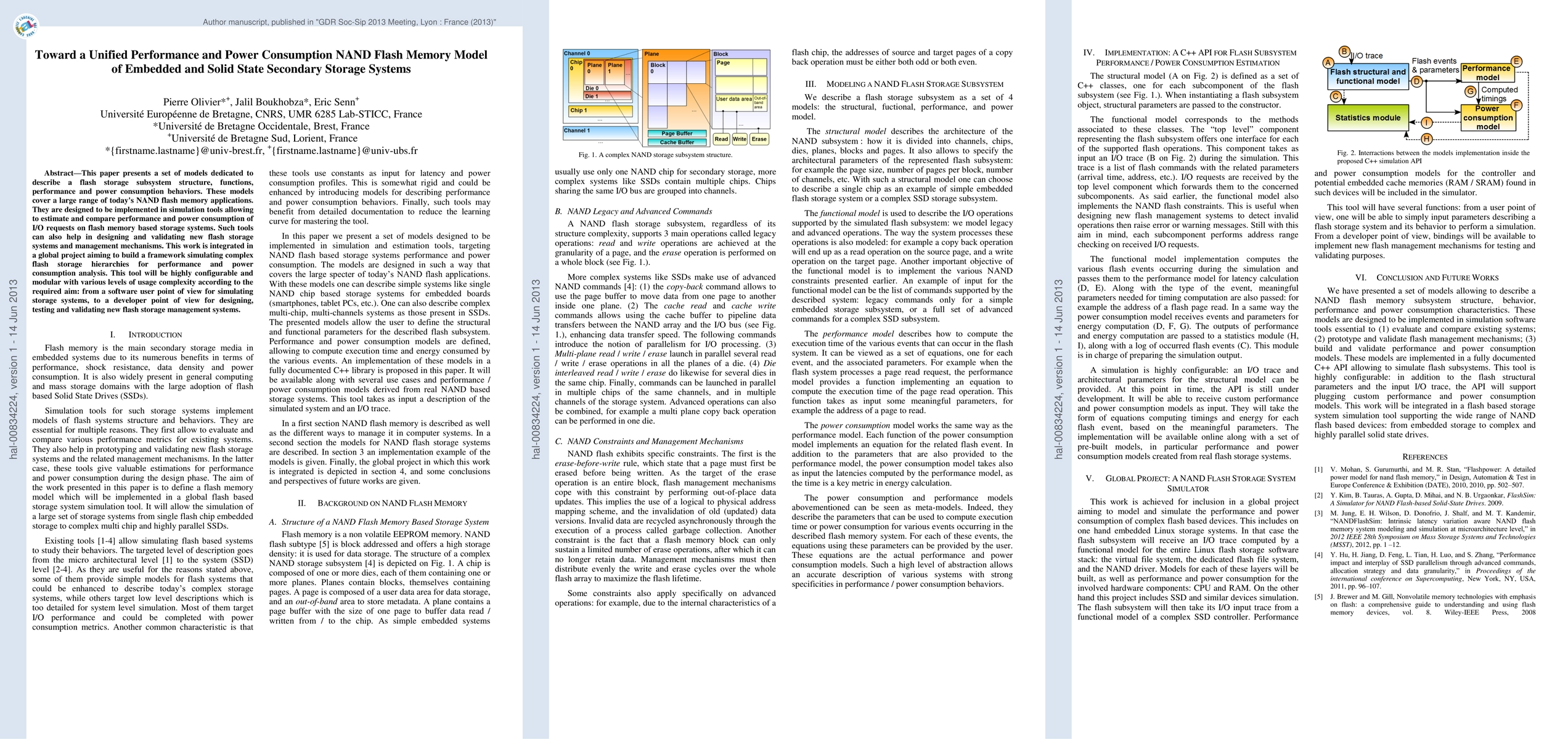 This paper introduces a set of models to analyze performance and power consumption of NAND flash memory in embedded systems, aiming to design and validate new storage management systems.