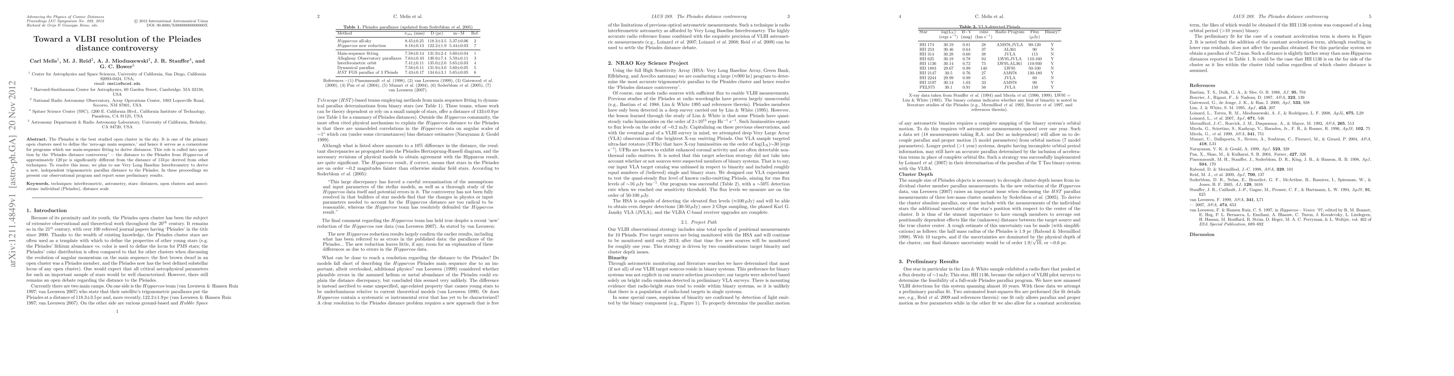 This paper outlines a plan to resolve the Pleiades distance controversy using Very Long Baseline Interferometry (VLBI) to obtain a new trigonometric parallax, aiming to reconcile differing distance measurements of 120 pc from Hipparcos and 133 pc from other methods. Preliminary results from the observational program are also presented.