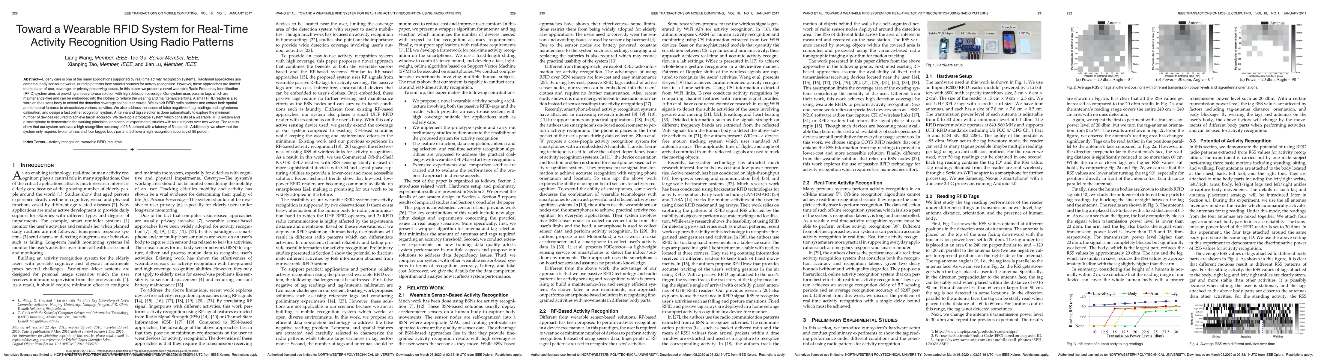 This paper proposes a novel wearable RFID system for real-time activity recognition in elderly care, utilizing passive RFID tags embedded in clothing and a small RFID reader worn by the user. The system achieves high recognition accuracy of 93.6 percent with minimal false negatives and requires only two antennas and four tagged body parts.