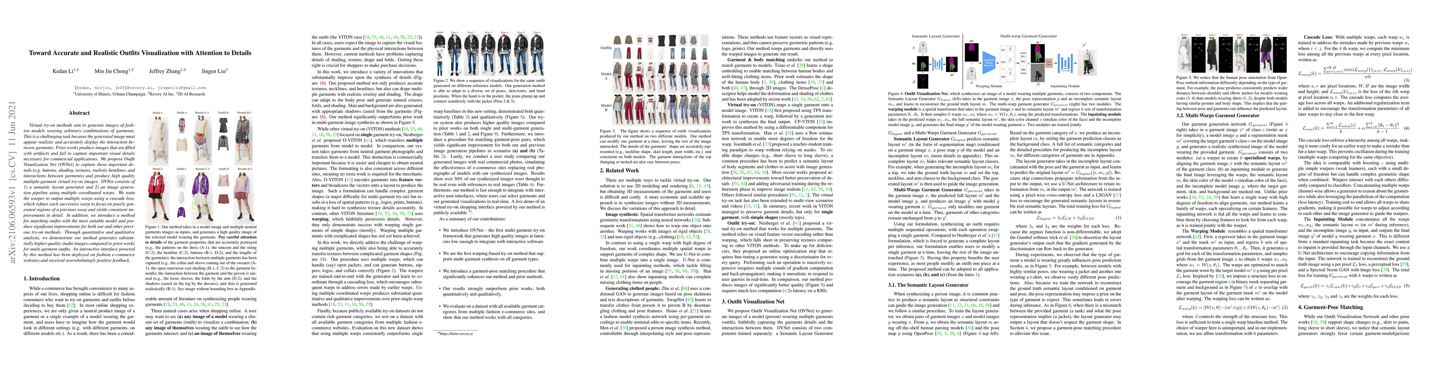 This paper proposes a method called Outfit Visualization Net to generate high-quality images of fashion models wearing arbitrary combinations of garments, improving realism and detail accuracy compared to existing methods.
