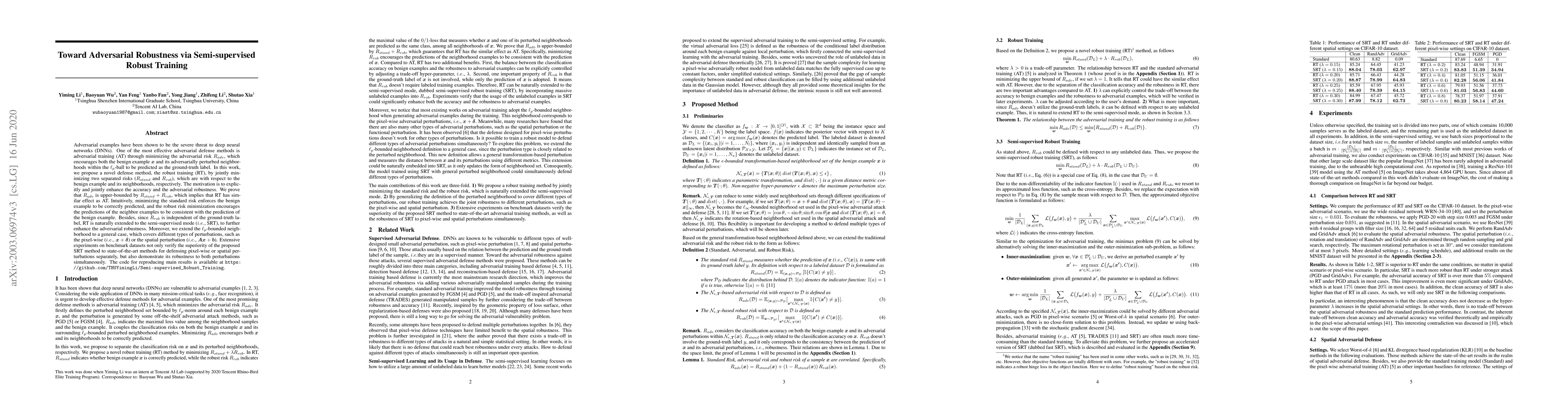 Adversarial examples have been shown to be the severe threat to deep neural networks (DNNs). One of the most effective adversarial defense methods is adversarial training (AT) through minimizing the adversarial risk $R_{adv}$, which encourages both the benign example $x$ and its adversarially perturbed neighborhoods within the $\ell_{p}$-ball to be predicted as the ground-truth label. In this work, we propose a novel defense method, the robust training (RT), by jointly minimizing two separated risks ($R_{stand}$ and $R_{rob}$), which is with respect to the benign example and its neighborhoods respectively. The motivation is to explicitly and jointly enhance the accuracy and the adversarial robustness. We prove that $R_{adv}$ is upper-bounded by $R_{stand} + R_{rob}$, which implies that RT has similar effect as AT. Intuitively, minimizing the standard risk enforces the benign example to be correctly predicted, and the robust risk minimization encourages the predictions of the neighbor examples to be consistent with the prediction of the benign example. Besides, since $R_{rob}$ is independent of the ground-truth label, RT is naturally extended to the semi-supervised mode ($i.e.$, SRT), to further enhance the adversarial robustness. Moreover, we extend the $\ell_{p}$-bounded neighborhood to a general case, which covers different types of perturbations, such as the pixel-wise ($i.e.$, $x + \delta$) or the spatial perturbation ($i.e.$, $ AX + b$). Extensive experiments on benchmark datasets not only verify the superiority of the proposed SRT method to state-of-the-art methods for defensing pixel-wise or spatial perturbations separately, but also demonstrate its robustness to both perturbations simultaneously. The code for reproducing main results is available at \url{https://github.com/THUYimingLi/Semi-supervised_Robust_Training}.