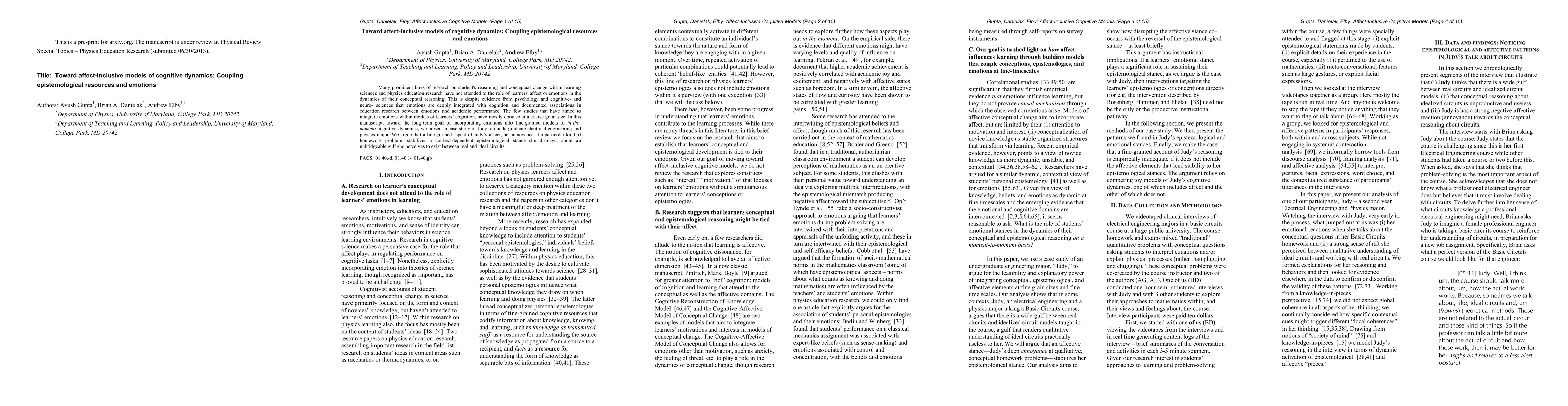 This paper explores the integration of emotions into fine-grained models of cognitive dynamics, using a case study of Judy, an undergraduate student, to demonstrate how her annoyance influences her epistemological stance regarding circuit theory. It argues for the necessity of incorporating emotions in understanding student reasoning and conceptual change.