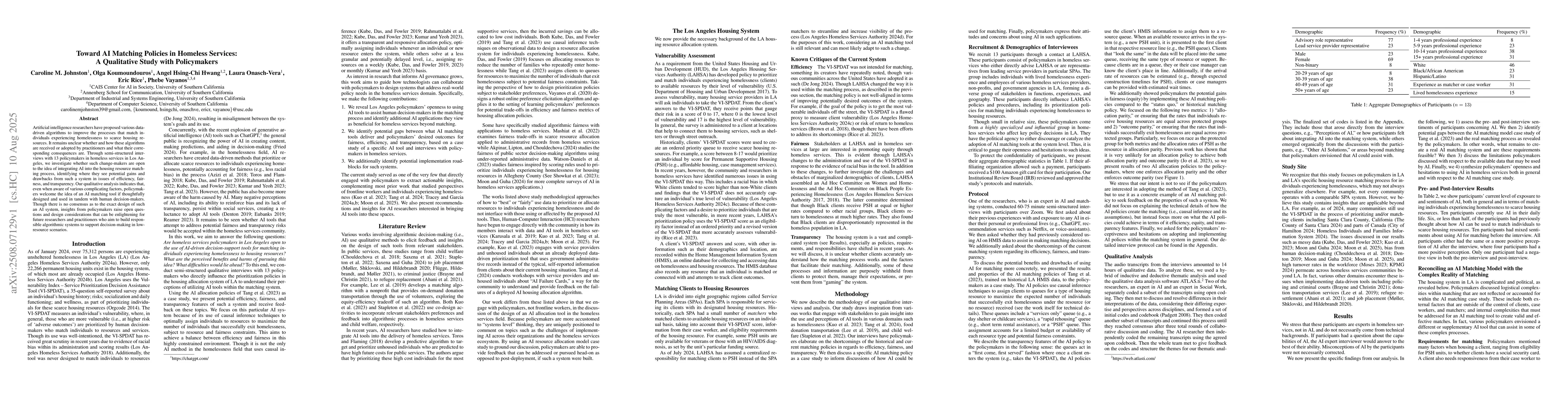 This qualitative study involved semi-structured interviews with 13 policymakers in homeless services in Los Angeles, exploring their openness to integrating AI into the housing resource matching process.