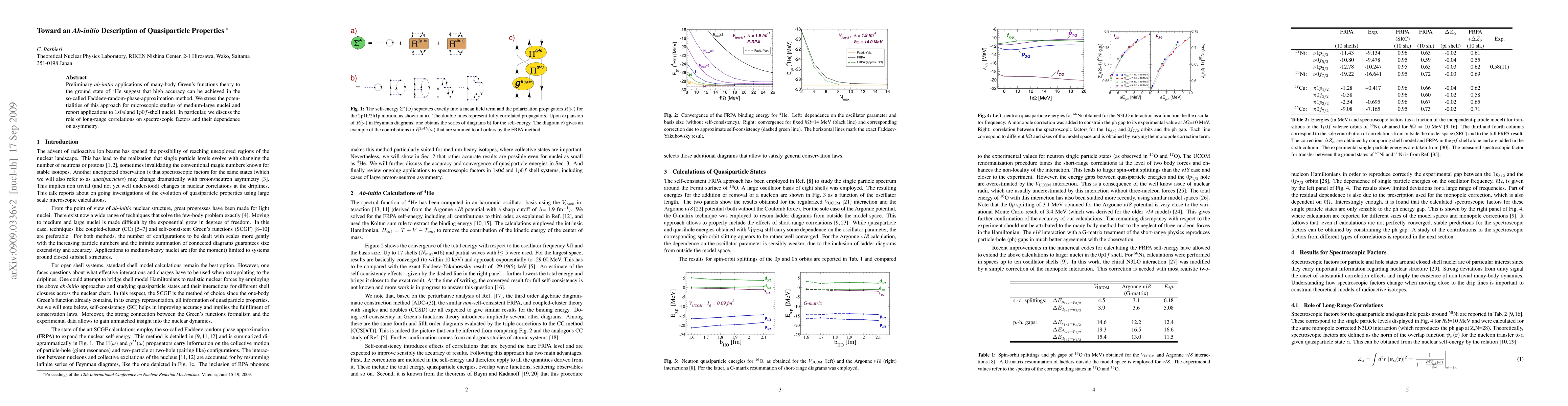 Preliminary ab-initio applications of many-body Green's functions theory to the ground state of He-4 suggest that high accuracy can be achieved in the so-called Faddeev-random-phase-approximation method. We stress the potentialities of this approach for microscopic studies of medium-large nuclei and report applications to 1s0d and 1p0f-shell nuclei. In particular, we discuss the role of long-range correlations on spectroscopic factors and their dependence on asymmetry.