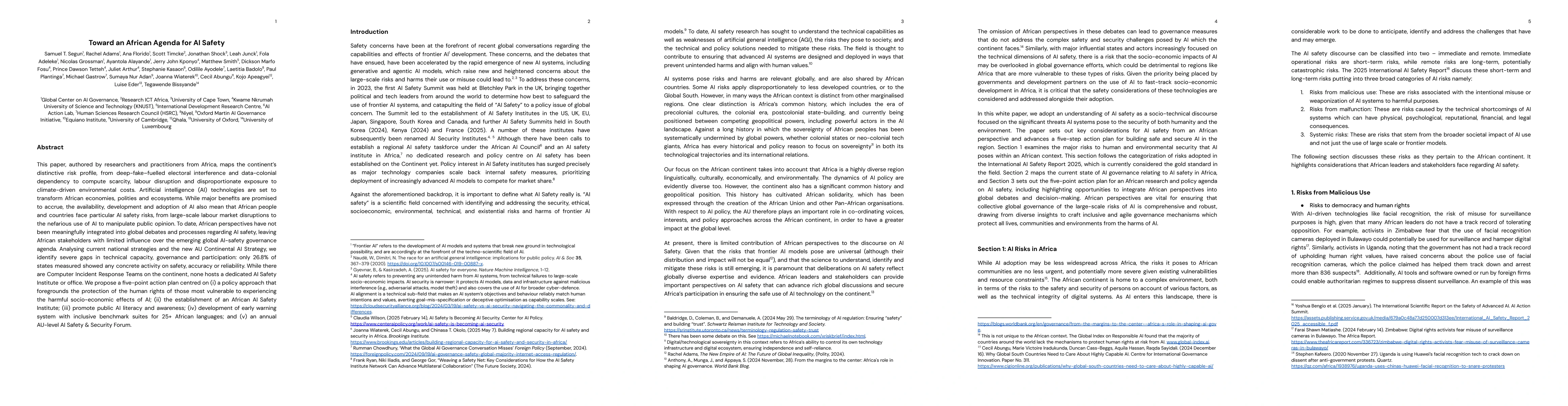 This paper maps Africa's distinctive AI risk profile, from deepfake fuelled electoral interference and data colonial dependency to compute scarcity, labour disruption and disproportionate exposure to climate driven environmental costs. While major benefits are promised to accrue, the availability, development and adoption of AI also mean that African people and countries face particular AI safety risks, from large scale labour market disruptions to the nefarious use of AI to manipulate public opinion. To date, African perspectives have not been meaningfully integrated into global debates and processes regarding AI safety, leaving African stakeholders with limited influence over the emerging global AI safety governance agenda. While there are Computer Incident Response Teams on the continent, none hosts a dedicated AI Safety Institute or office. We propose a five-point action plan centred on (i) a policy approach that foregrounds the protection of the human rights of those most vulnerable to experiencing the harmful socio-economic effects of AI; (ii) the establishment of an African AI Safety Institute; (iii) promote public AI literacy and awareness; (iv) development of early warning system with inclusive benchmark suites for 25+ African languages; and (v) an annual AU-level AI Safety & Security Forum.