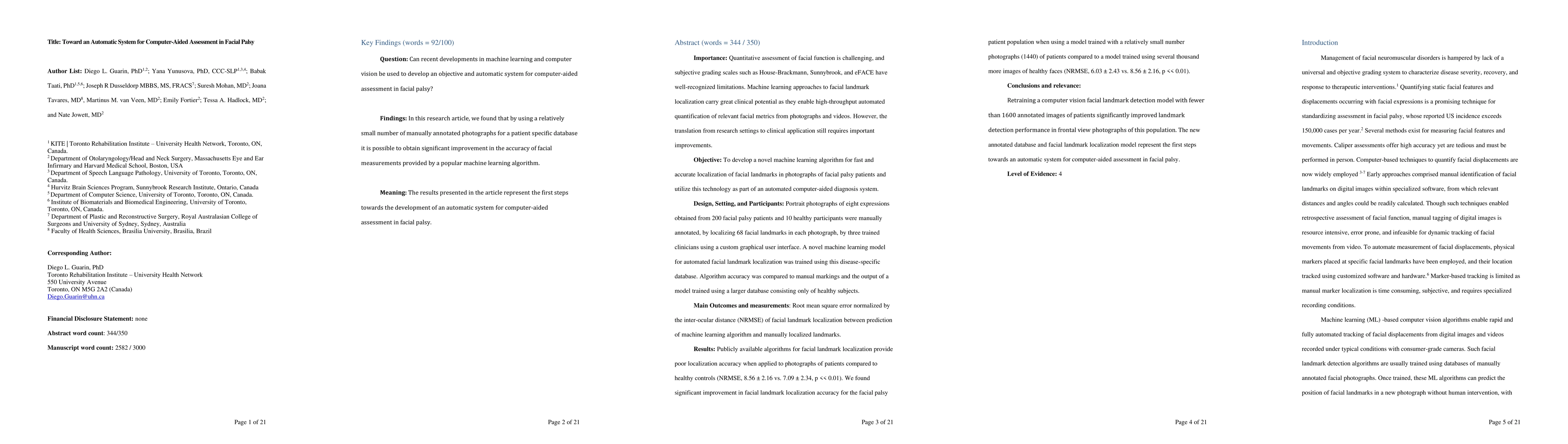 Importance: Machine learning (ML) approaches to facial landmark localization carry great clinical potential for quantitative assessment of facial function as they enable high-throughput automated quantification of relevant facial metrics from photographs. However, translation from research settings to clinical applications requires important improvements. Objective: To develop an ML algorithm for accurate facial landmarks localization in photographs of facial palsy patients, and use it as part of an automated computer-aided diagnosis system. Design, Setting, and Participants: Facial landmarks were manually localized in portrait photographs of eight expressions obtained from 200 facial palsy patients and 10 controls. A novel ML model for automated facial landmark localization was trained using this disease-specific database. Model output was compared to manual annotations and the output of a model trained using a larger database consisting only of healthy subjects. Model accuracy was evaluated by the normalized root mean square error (NRMSE) between algorithms' prediction and manual annotations. Results: Publicly available algorithms provide poor results when applied to patients compared to healthy controls (NRMSE, 8.56 +/- 2.16 vs. 7.09 +/- 2.34, p << 0.01). We found significant improvement in facial landmark localization accuracy for the clinical population when using a model trained with a relatively small number patients' photographs (1440) compared to a model trained using several thousand more images of healthy faces (NRMSE, 6.03 +/- 2.43 vs. 8.56 +/- 2.16, p << 0.01). Conclusions: Retraining a landmark detection model with a small number of clinical images significantly improved landmark detection performance in frontal view photographs of the clinical population. These results represent the first steps towards an automatic system for computer-aided assessment in facial palsy.