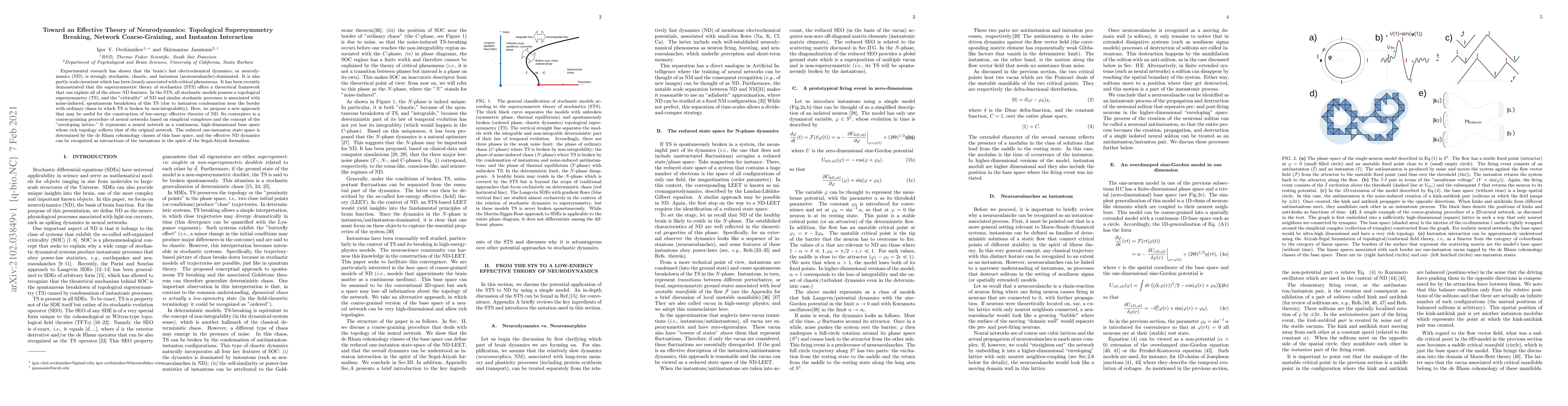 Experimental research has shown that the brain's fast electrochemical dynamics, or neurodynamics (ND), is strongly stochastic, chaotic, and instanton (neuroavalanche)-dominated. It is also partly scale-invariant which has been loosely associated with critical phenomena. It has been recently demonstrated that the supersymmetric theory of stochastics (STS) offers a theoretical framework that can explain all of the above ND features. In the STS, all stochastic models possess a topological supersymmetry (TS), and the "criticality" of ND and similar stochastic processes is associated with noise-induced, spontaneous breakdown of this TS (due to instanton condensation near the border with ordinary chaos in which TS is broken by non-integrability). Here, we propose a new approach that may be useful for the construction of low-energy effective theories of ND. Its centerpiece is a coarse-graining procedure of neural networks based on simplicial complexes and the concept of the "enveloping lattice." It represents a neural network as a continuous, high-dimensional base space whose rich topology reflects that of the original network. The reduced one-instanton state space is determined by the de Rham cohomology classes of this base space, and the effective ND dynamics can be recognized as interactions of the instantons in the spirit of the Segal-Atiyah formalism.