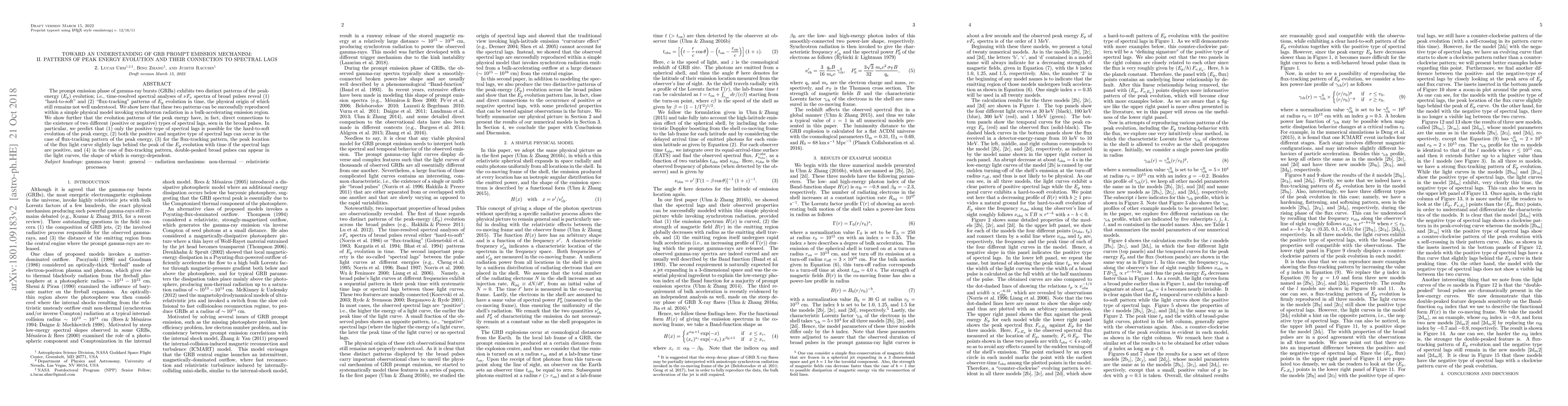This paper explores the distinct patterns of peak energy evolution in gamma-ray bursts (GRBs) and their connection to spectral lags, proposing a synchrotron radiation model to explain the observed "hard-to-soft" and "flux-tracking" patterns. It predicts specific types of spectral lags associated with each pattern and discusses the implications for GRB light curve structures.
