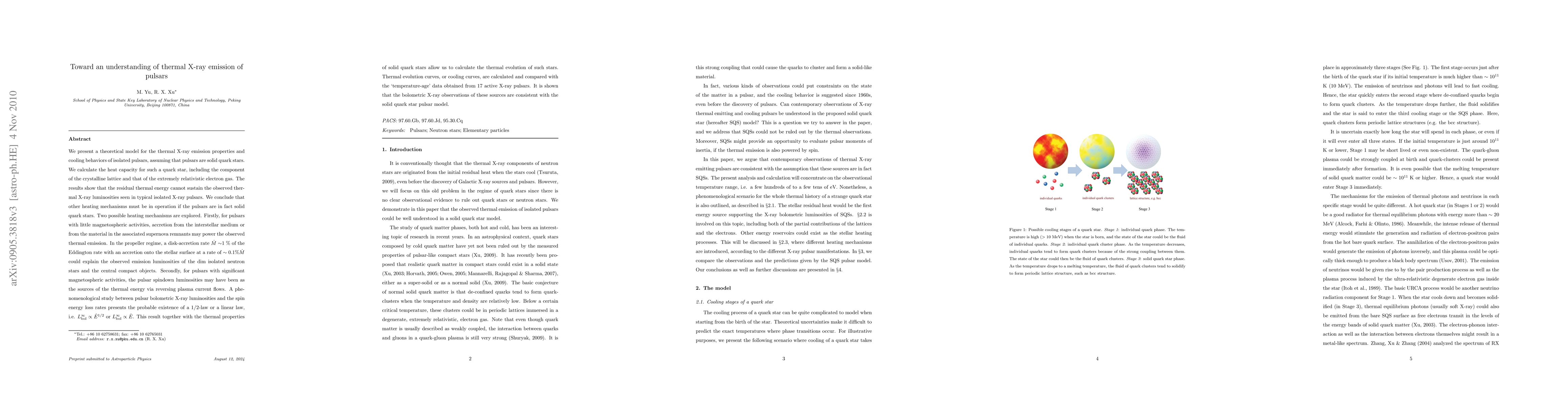 This paper proposes a theoretical model for the thermal X-ray emission from isolated pulsars, assuming they are solid quark stars. It finds that residual thermal energy alone cannot account for observed luminosities, suggesting alternative heating mechanisms such as accretion or spindown-induced plasma currents.