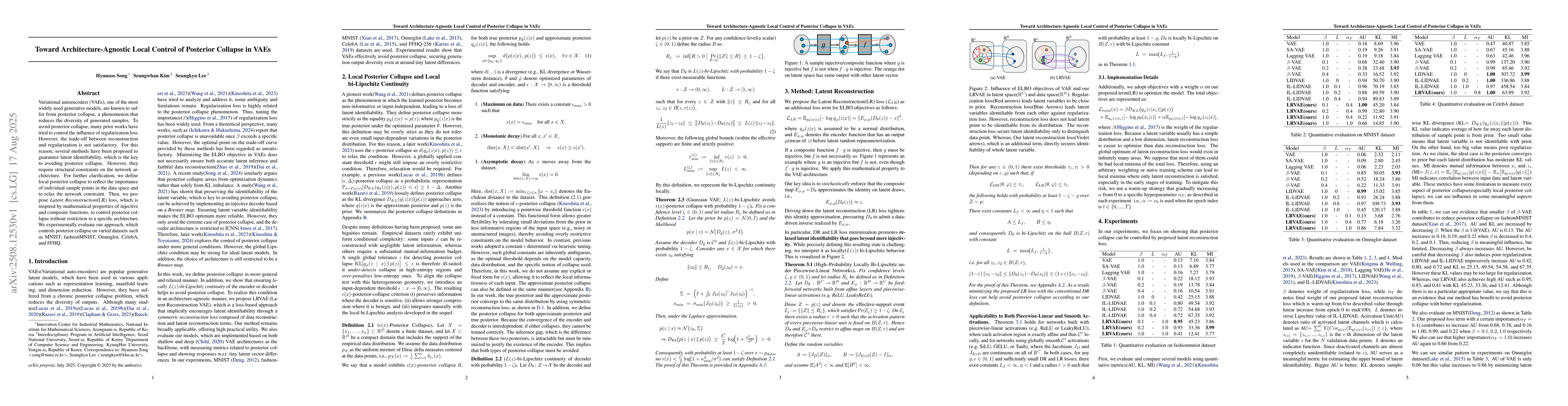 Variational autoencoders (VAEs), one of the most widely used generative models, are known to suffer from posterior collapse, a phenomenon that reduces the diversity of generated samples. To avoid posterior collapse, many prior works have tried to control the influence of regularization loss. However, the trade-off between reconstruction and regularization is not satisfactory. For this reason, several methods have been proposed to guarantee latent identifiability, which is the key to avoiding posterior collapse. However, they require structural constraints on the network architecture. For further clarification, we define local posterior collapse to reflect the importance of individual sample points in the data space and to relax the network constraint. Then, we propose Latent Reconstruction(LR) loss, which is inspired by mathematical properties of injective and composite functions, to control posterior collapse without restriction to a specific architecture. We experimentally evaluate our approach, which controls posterior collapse on varied datasets such as MNIST, fashionMNIST, Omniglot, CelebA, and FFHQ.