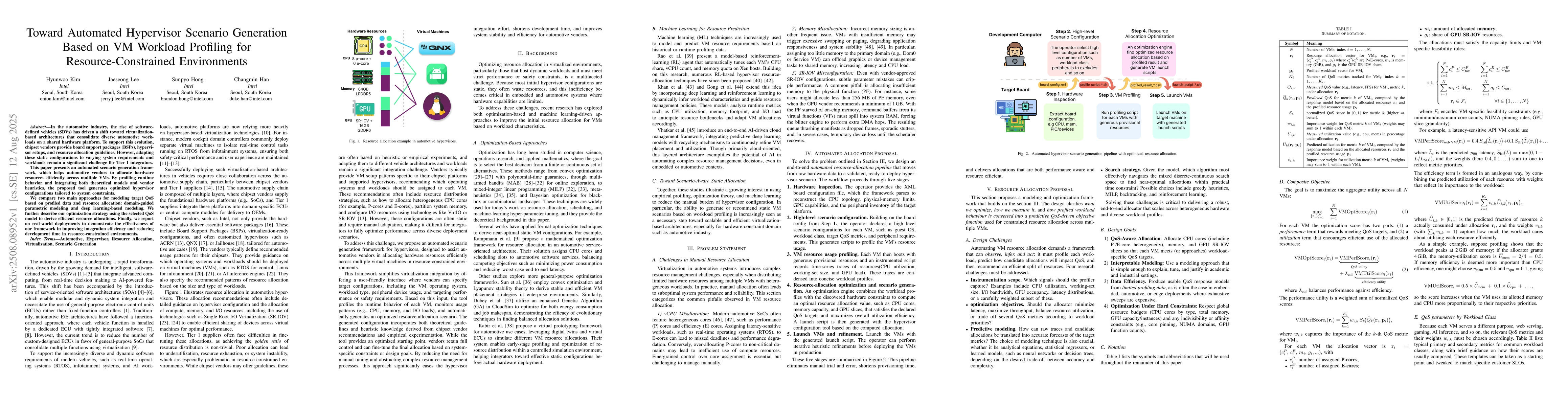 In the automotive industry, the rise of software-defined vehicles (SDVs) has driven a shift toward virtualization-based architectures that consolidate diverse automotive workloads on a shared hardware platform. To support this evolution, chipset vendors provide board support packages (BSPs), hypervisor setups, and resource allocation guidelines. However, adapting these static configurations to varying system requirements and workloads remain a significant challenge for Tier 1 integrators. This paper presents an automated scenario generation framework, which helps automotive vendors to allocate hardware resources efficiently across multiple VMs. By profiling runtime behavior and integrating both theoretical models and vendor heuristics, the proposed tool generates optimized hypervisor configurations tailored to system constraints. We compare two main approaches for modeling target QoS based on profiled data and resource allocation: domain-guided parametric modeling and deep learning-based modeling. We further describe our optimization strategy using the selected QoS model to derive efficient resource allocations. Finally, we report on real-world deployments to demonstrate the effectiveness of our framework in improving integration efficiency and reducing development time in resource-constrained environments.
